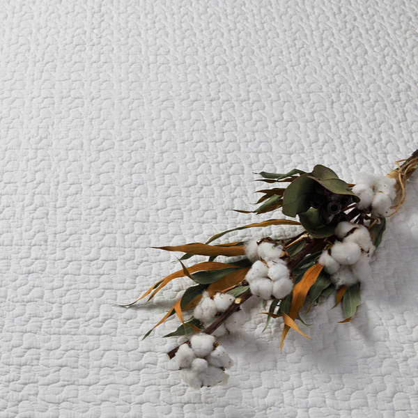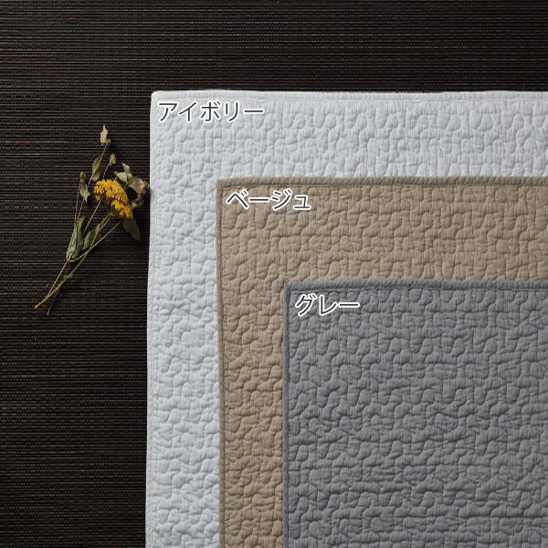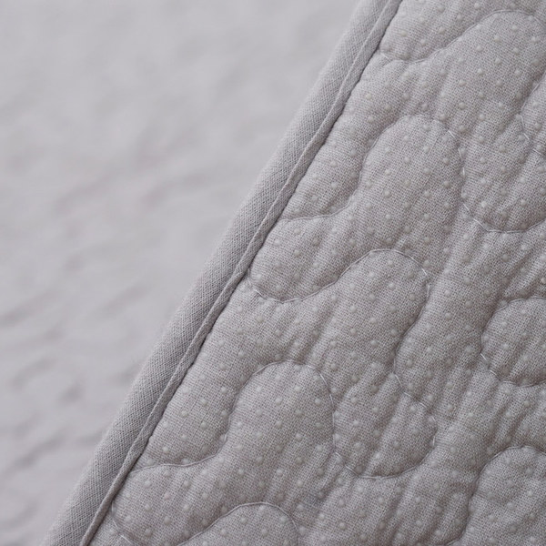 中綿入りのぽこぽことした凹凸のあるキルティングと、淡く優しい色みが魅力的です。シンプルでナチュラルな色合いなので、いろんなお部屋に合わせやすいです。