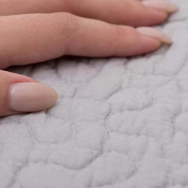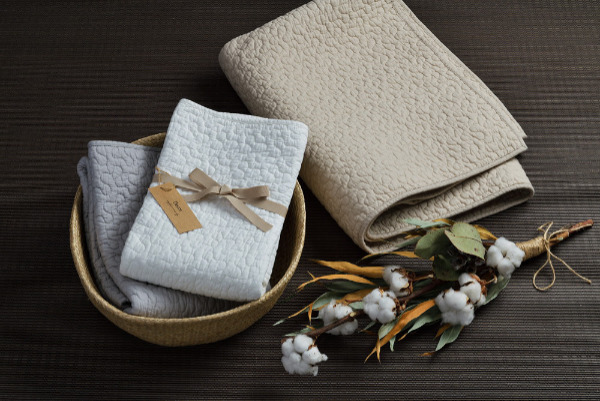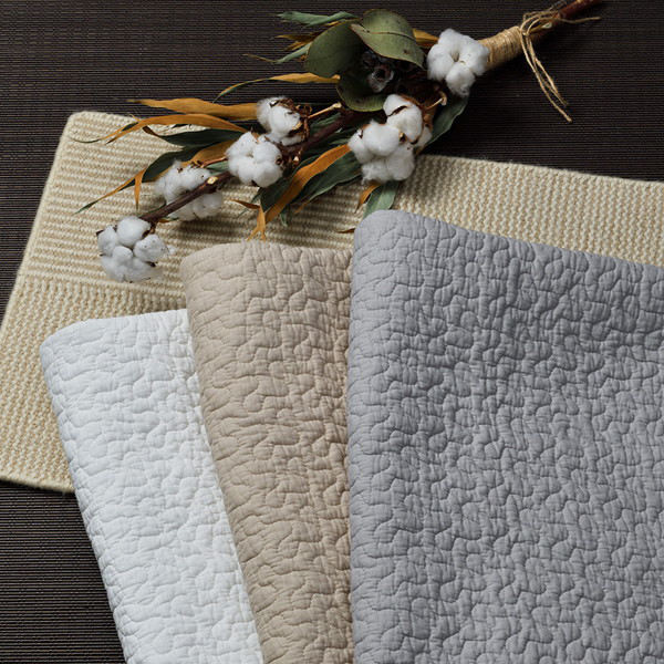 中綿入りのぽこぽことした凹凸のあるキルティングと、淡く優しい色みが魅力的です。シンプルでナチュラルな色合いなので、いろんなお部屋に合わせやすいです。