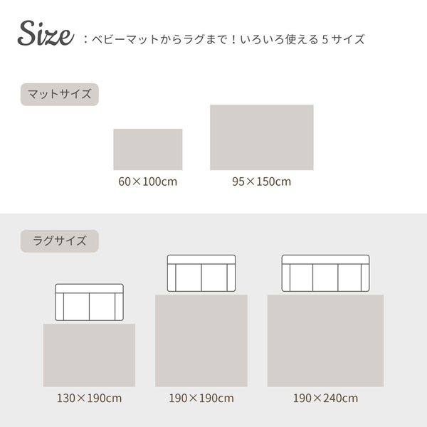 ベビーマットからラグまで、いろいろ使える5サイズ展開です。用途に合わせてお選びください。