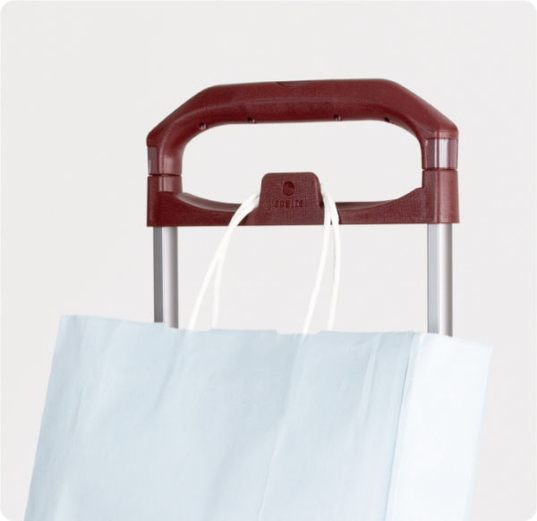 紙袋やスーパーの袋などを引っ掛けられるハンドル一体型のフック付きです。荷物が多い時も手で持たずに移動ができます。