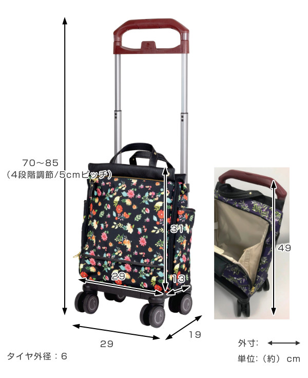 | サイズ | 約 幅29×奥行19×高さ49(cm) ハンドル部:4段階調節70~85(cm) 5cmピッチ バッグ部:約 幅29×奥行13×高さ31(cm)/容量 約 12L タイヤ外径:6(cm) 前輪・後輪共ダブルキャスター キャスター:360度回転 |
