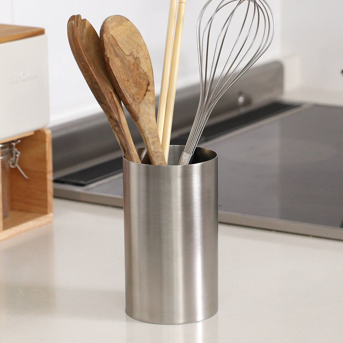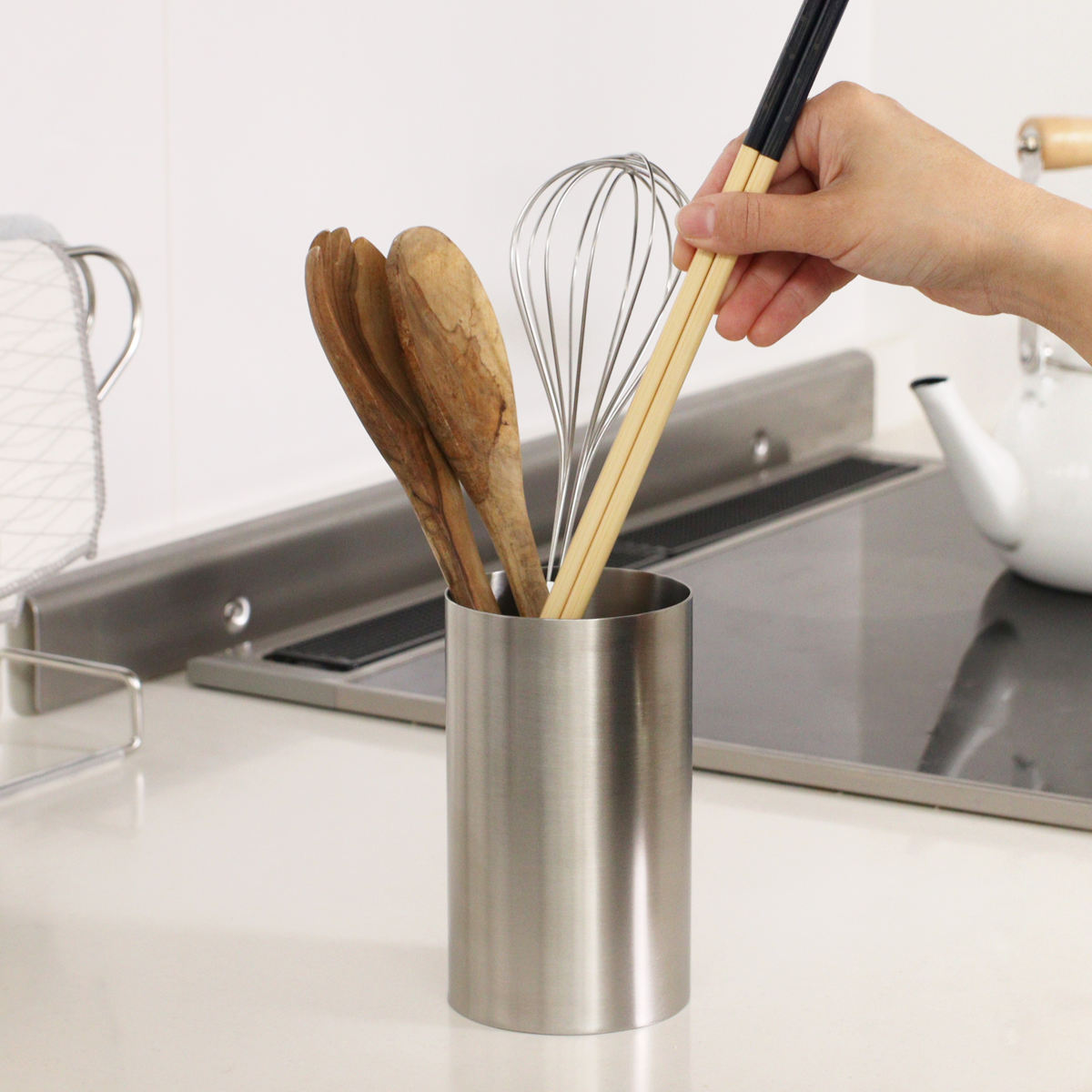 散らかりがちなキッチンツールを立ててスッキリ収納できる、オールステンレス製のカトラリースタンドです。深さがあるのでたっぷり入って、しっかりとした安定感があります。