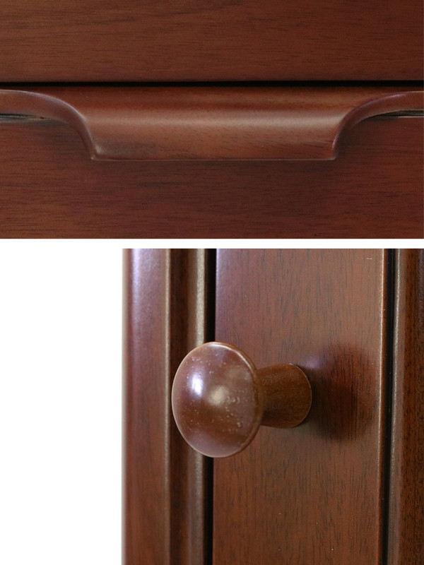 マホガニー材にミディアムブラウンのセミマッド塗装を施しています。手触りの良い取っ手と、すっきりと伸びた細身の脚が特徴です。お気に入りをいつもそばに置いておけるコンパクトなサイズです。