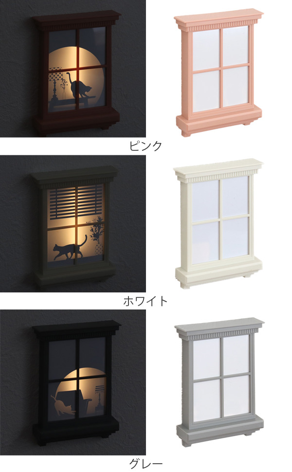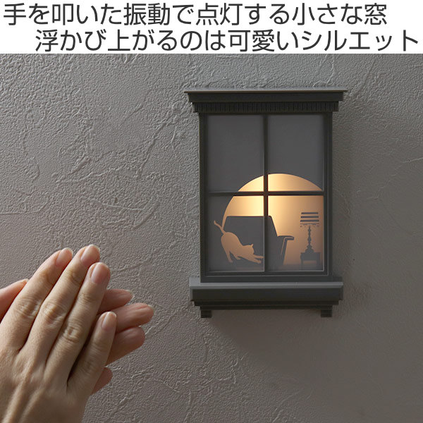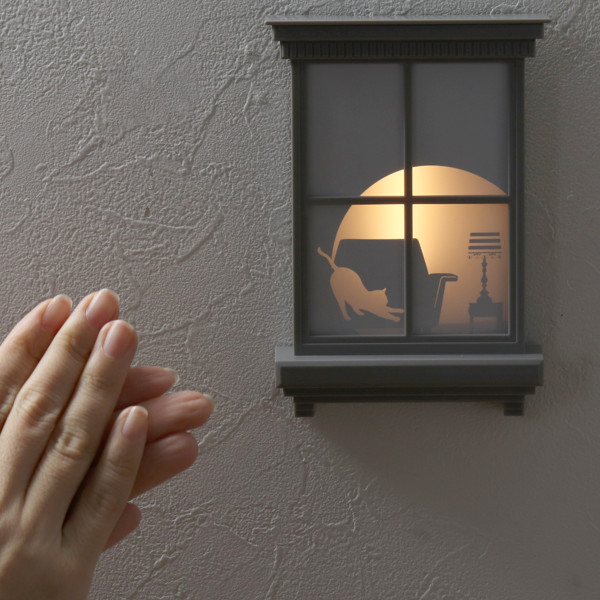 音感センサー内蔵の壁にかけて可愛い窓型のLEDウォールライトです。ドールハウスのような小さな窓に明かりが灯ると、室内のシルエットが浮かび上がります。暖色照明が点灯し、可愛いネコたちが浮かび上がるので、お部屋のインテリアのアクセントにおすすめです。昼間はウォールデコとして窓枠をお楽しみいただき、夜には温かみのある照明とシルエットで、和む雰囲気をお楽しみください。