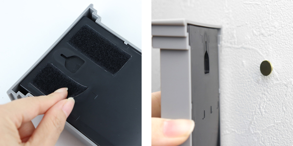 | ワンタッチテープ ワンタッチテープで取り付ける際は、テープの硬面を壁に、軟面を本体裏に貼り付けて取り付けます。 | 取り付けピン 設置したい壁にピンを刺し、本体裏面の穴部分を引っ掛けて取り付けます。 ※コンクリートなど一部の壁材によってはピンが刺さらない場合があります。 |