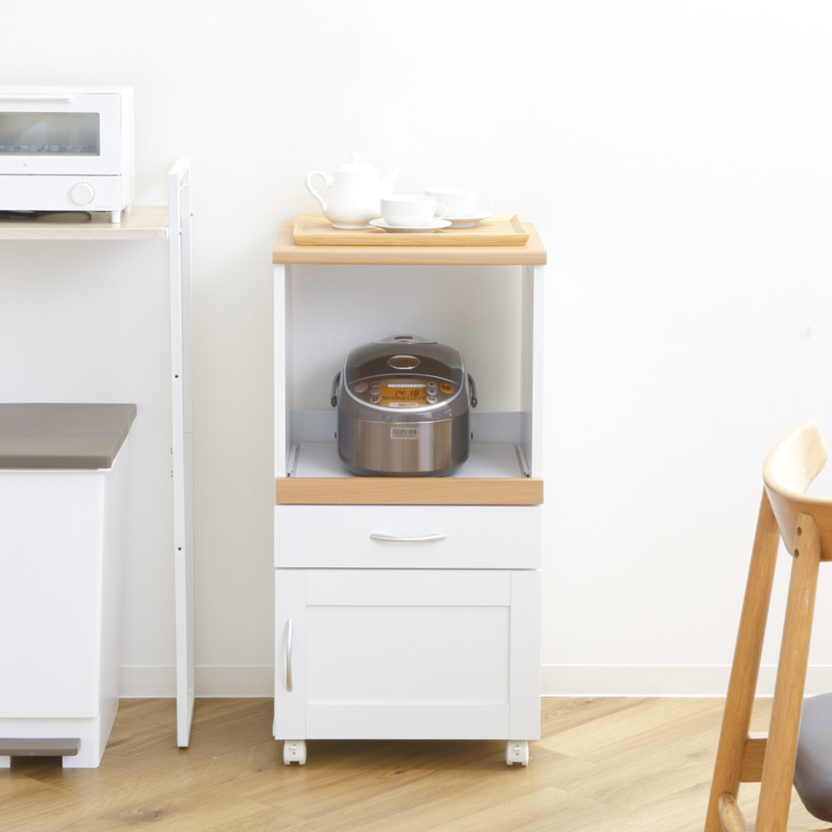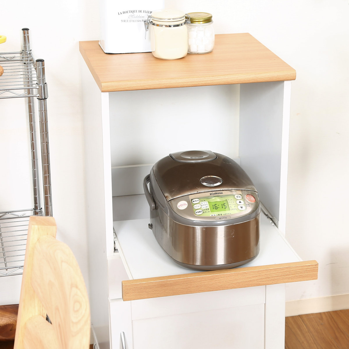炊飯器やポットなど、蒸気の出る家電を使用に便利な2口コンセント付きのスライド棚。使う時にだけ引き出してお使いいただけます。