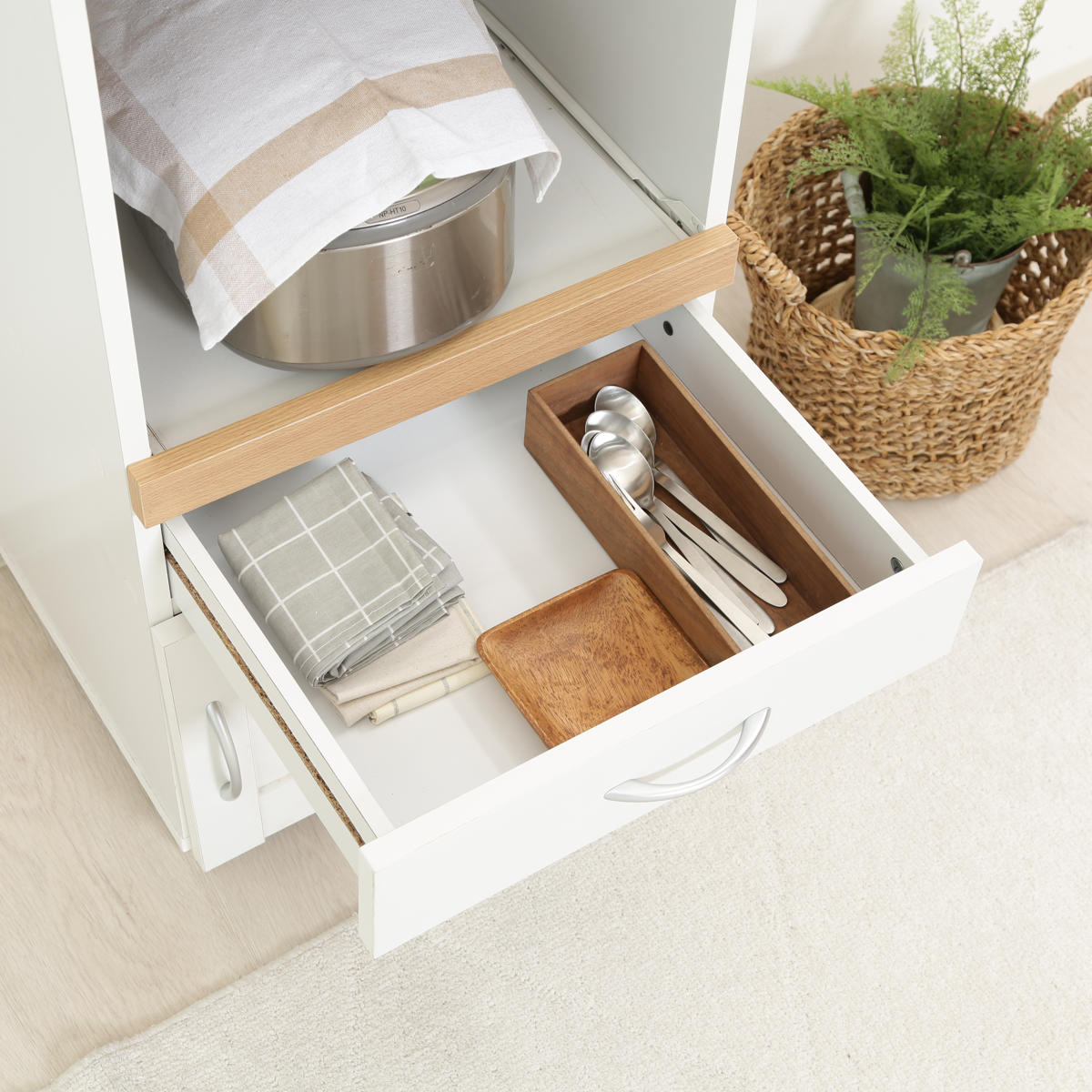 引出しはカトラリーや布巾などの小物の収納に最適です。ストッパー付きなので、万が一引き出しすぎてしまっても抜け落ちないので安心です