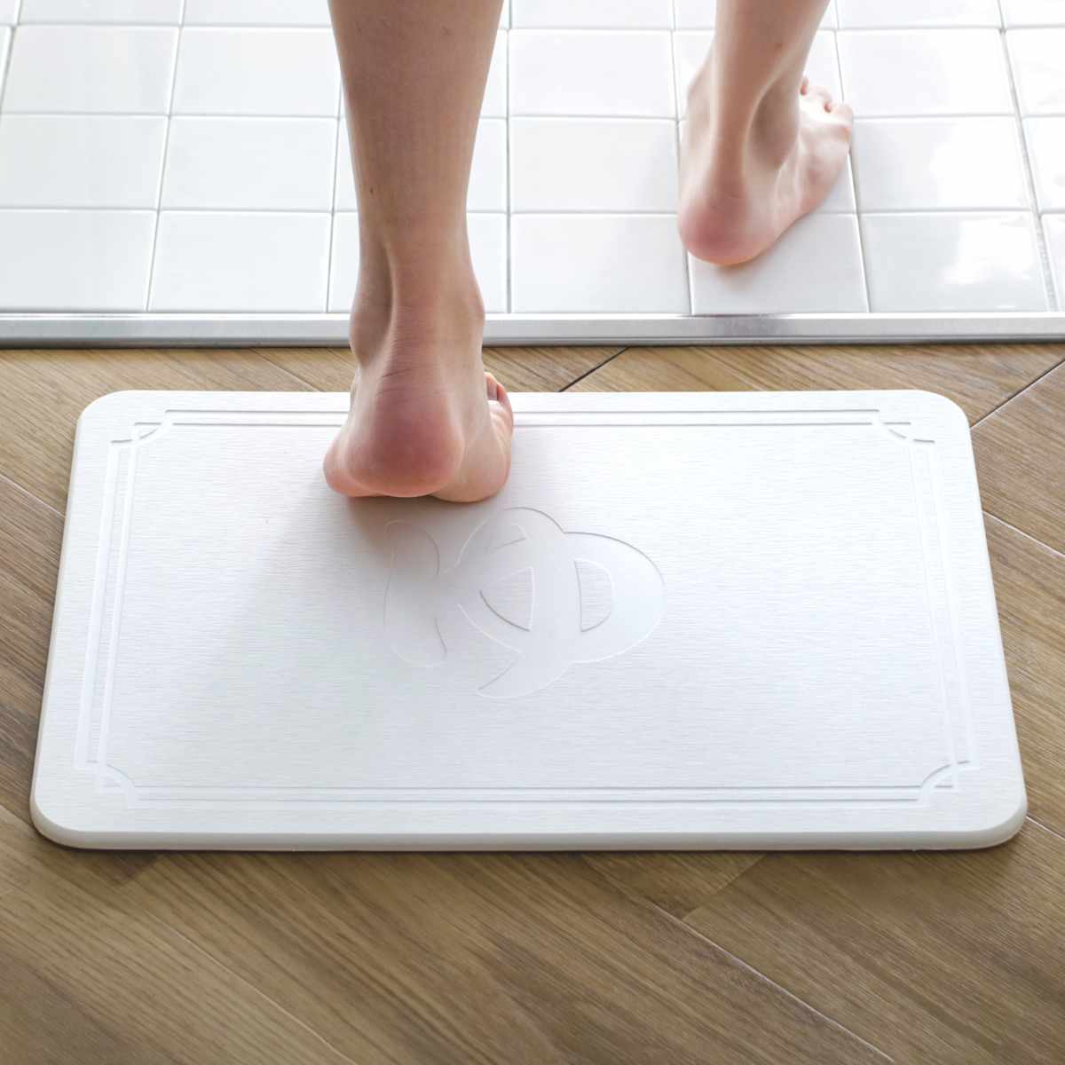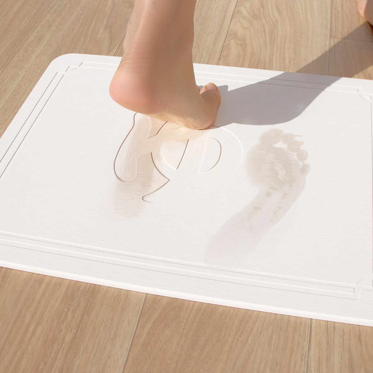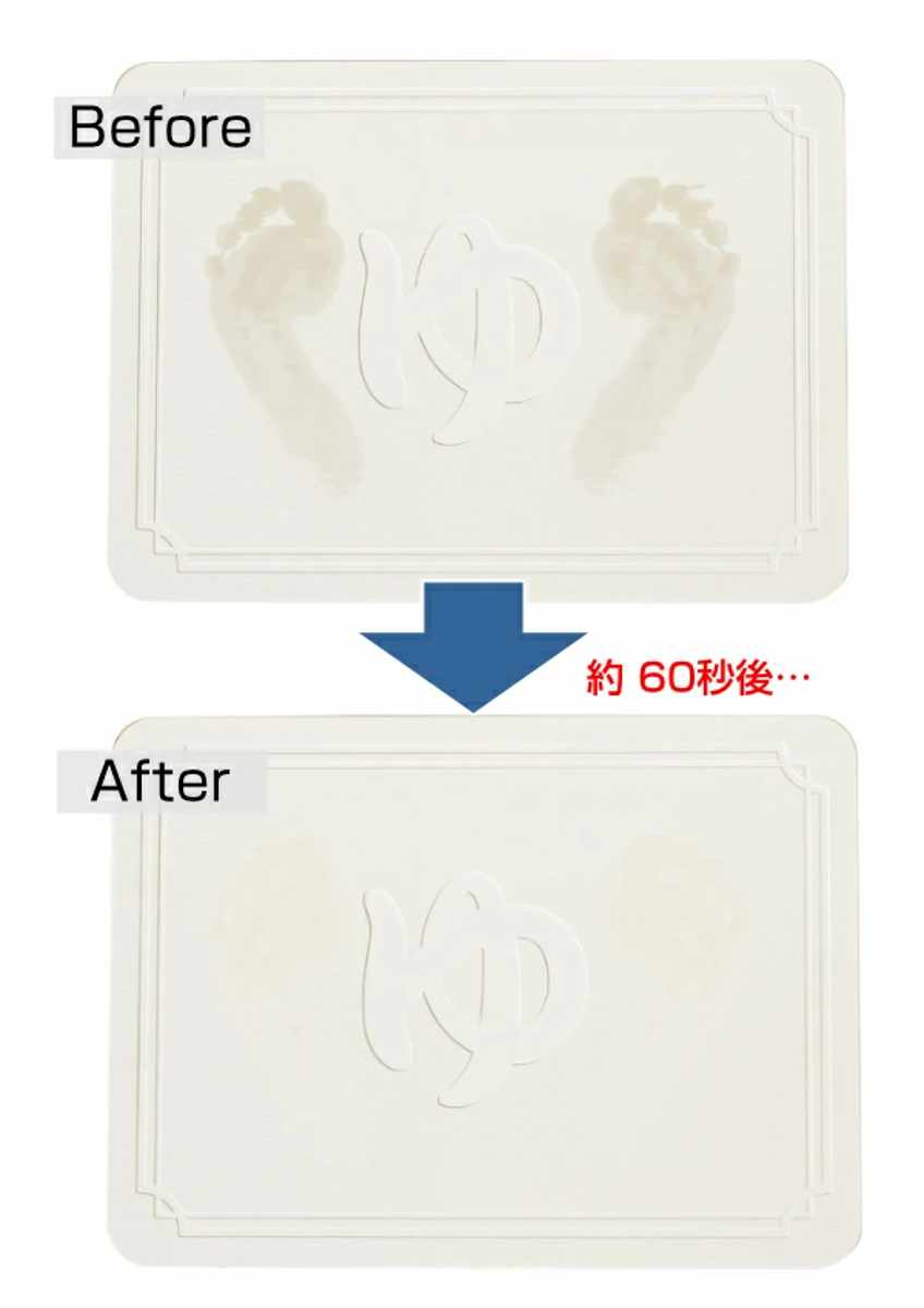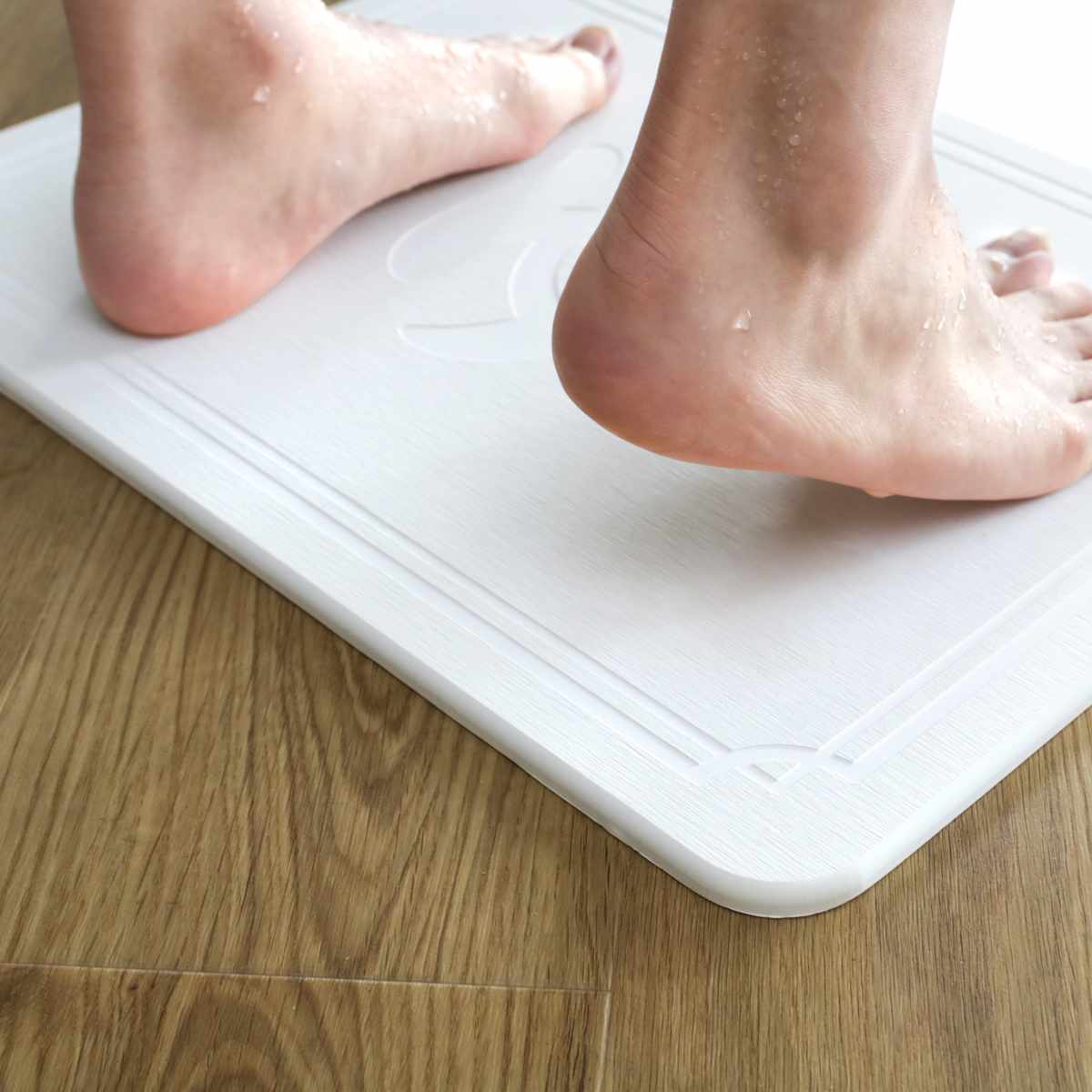 珪藻土バスマットに空いているナノサイズの無数の穴が、水分を瞬時に吸収するため、マットの表面は常に乾いた状態です。濡れた足をバスマットに乗せてからほんの数秒で、足裏の接する部分の水はほとんど吸いとられるので、いつもサラッと快適です。