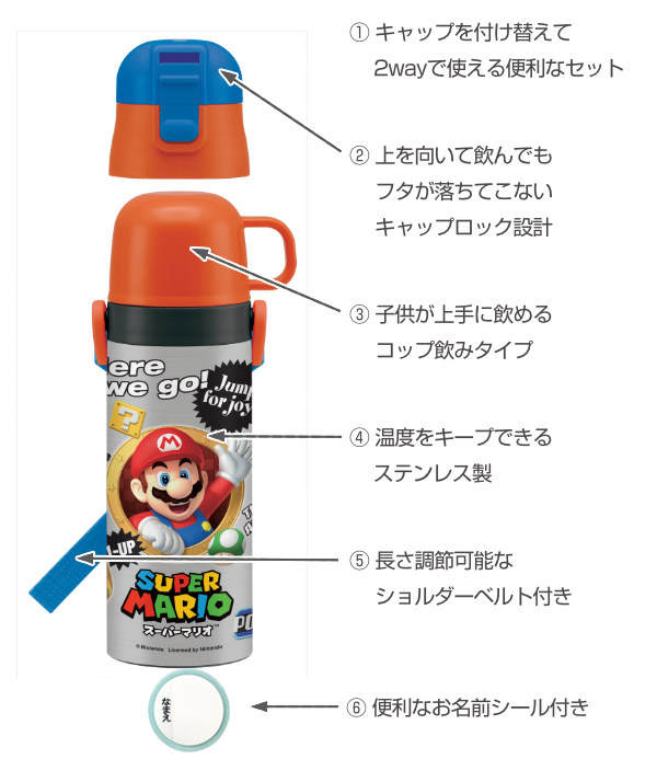 ●スーパーマリオブラザーズの直飲みとコップ飲みを使い分けられる2WAYタイプのステンレスボトルです。