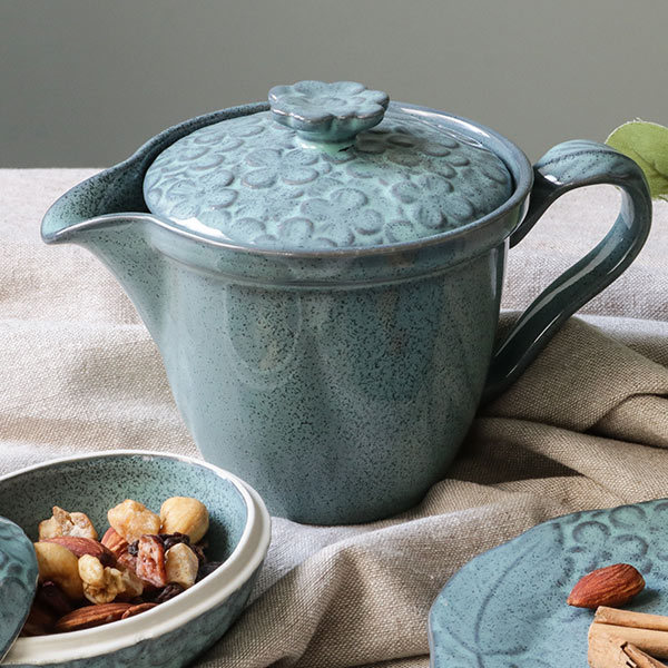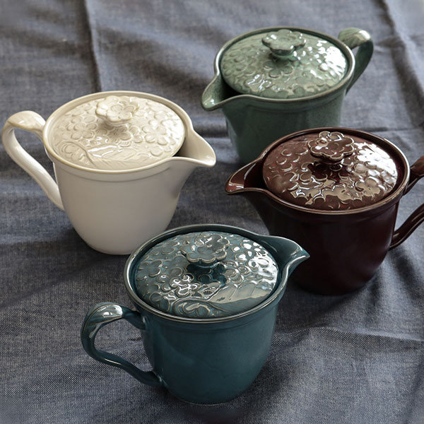 花々の浮き出た上品なデザインです。表面は光沢があり、陶器製ならではの落ち着いた風合いがあります。一点ずつ丁寧にハンドメイドされた美しい器は、特別感があり、毎日使うのが楽しみになります。