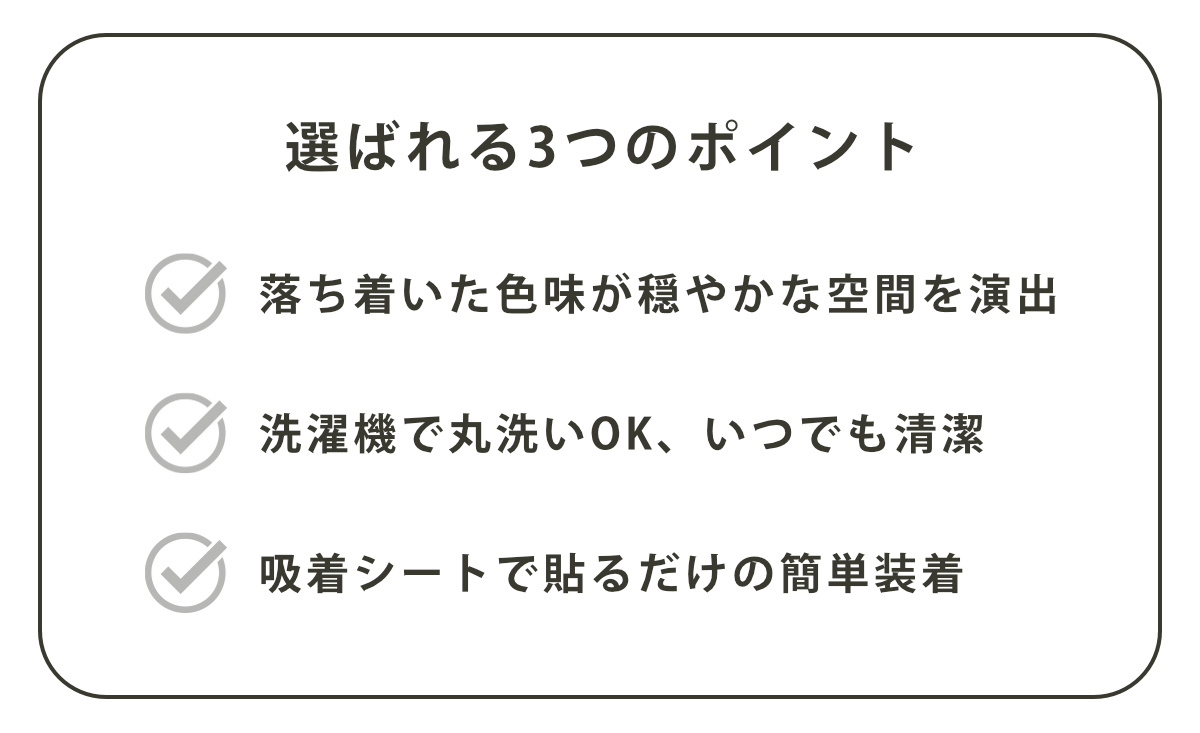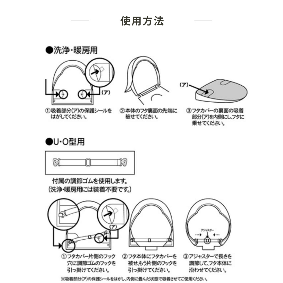 ●裏面に縫製された吸着シートにより、U・O型/洗浄・暖房タイプ、どの型にも対応できます。