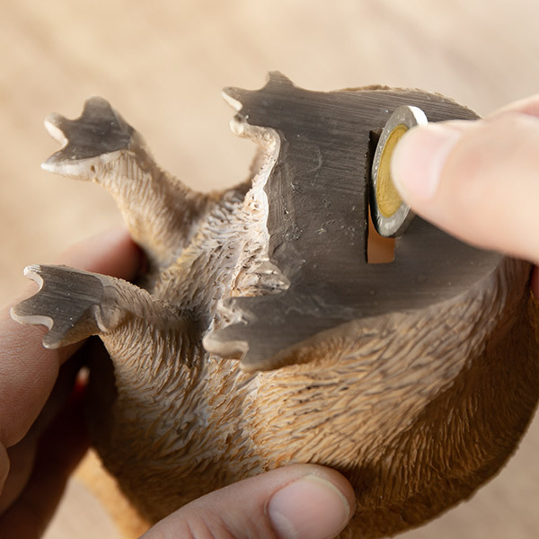 お尻の部分にコインを入れる穴があり、貯金箱としての役割も果たしてくれます。フタ等は無いため、コインを入れた後は机等の平らな場所に立たせてあげてください。
