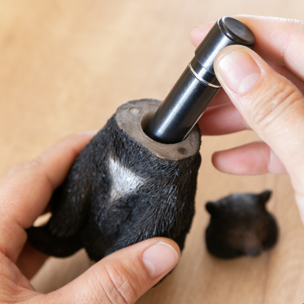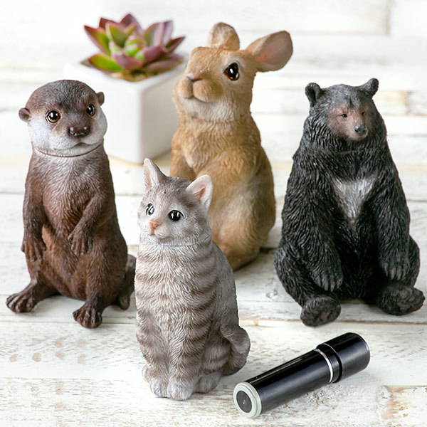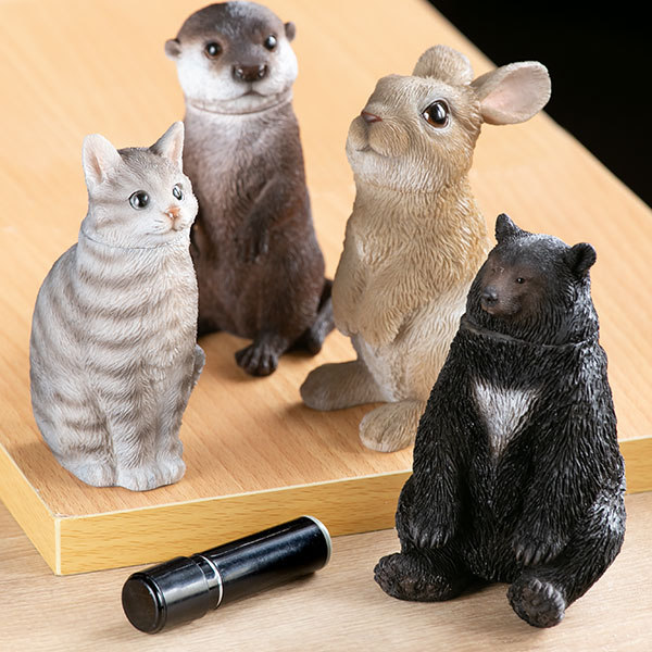 こちらの可愛い動物たち、実は顔がフタになっており印鑑を収納することが出来ます。玄関先に置いておくと普段はオブジェとしてお使いいただけ、宅急便が来たらサッと押印が出来て便利です。かわいくあなたのお役に立ってくれるアイテムです。