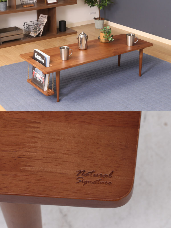 天然木を使用したナチュラルテイストのセンターテーブルです。天板には、お洒落な焼き印が入っています。