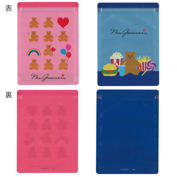 開け閉めできて保存に便利なチャックと入れやすいマチ付きで袋の底に厚みがあり、食品を保管しやすいです。バーガーデザインのブルーと、レインボーや風船などが描かれたピンクの2種類があります。