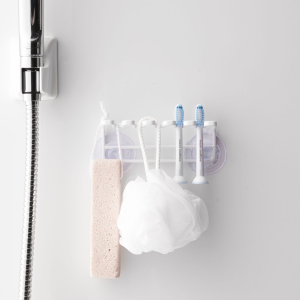 | 吸盤タイプ 吸盤タイプの歯ブラシホルダーなので、取り付けが簡単です。 | 使い分けが出来る 歯ブラシはもちろん、電子歯ブラシの替えブラシや、ボディスポンジなどお好みに合わせて使い分けることが出来ます。 |
