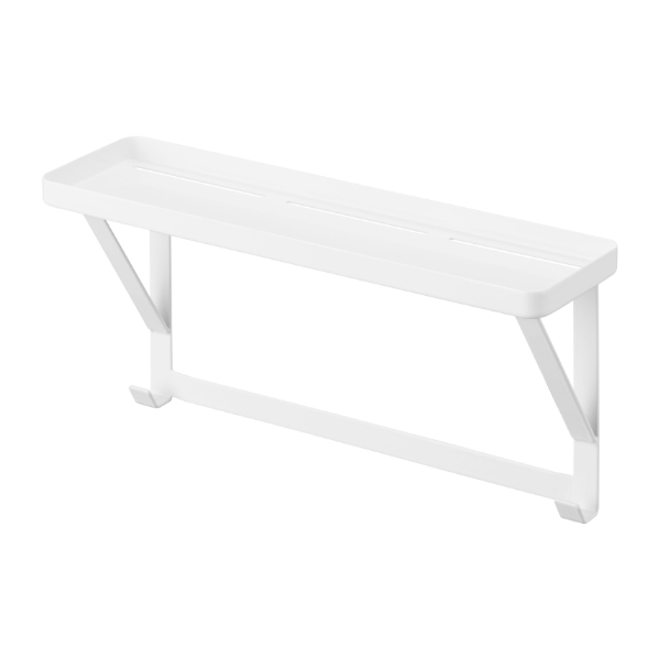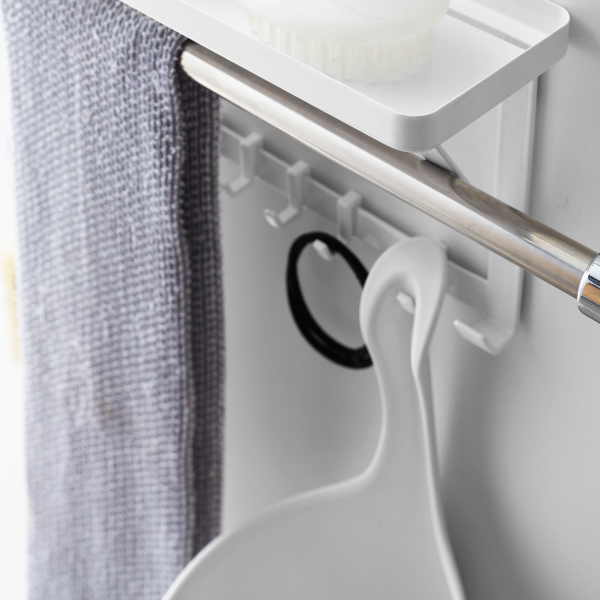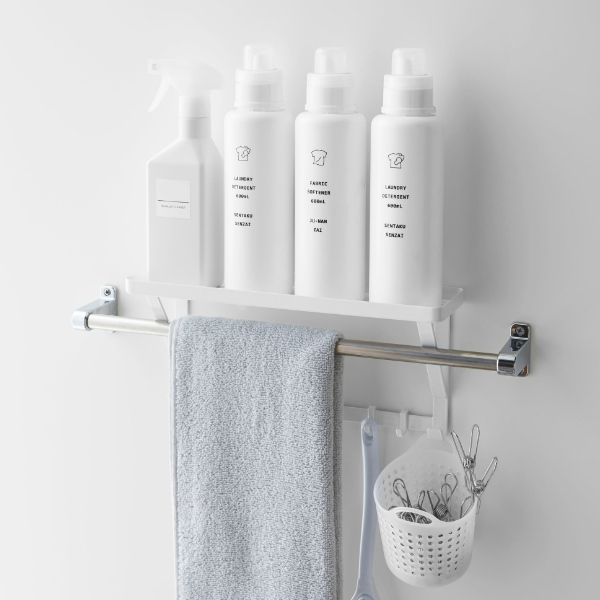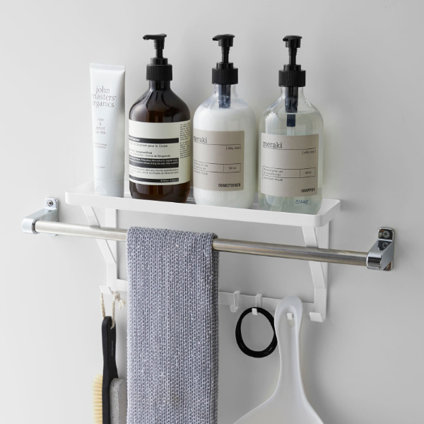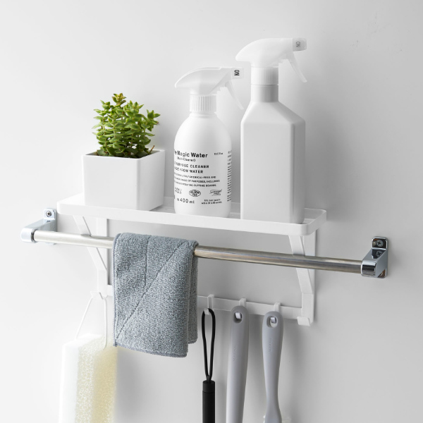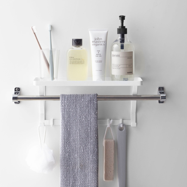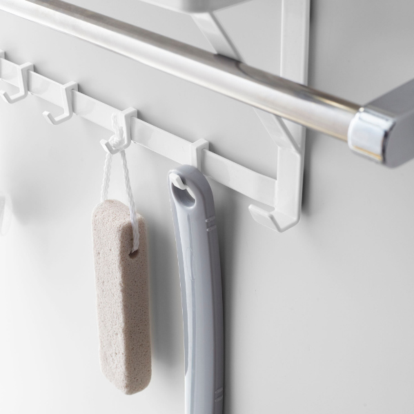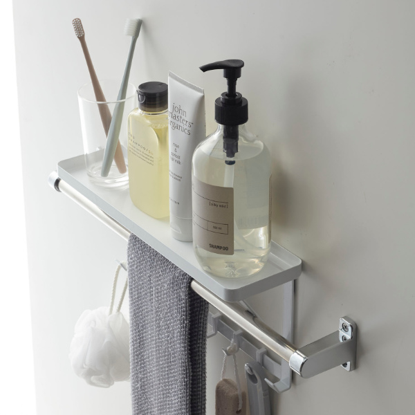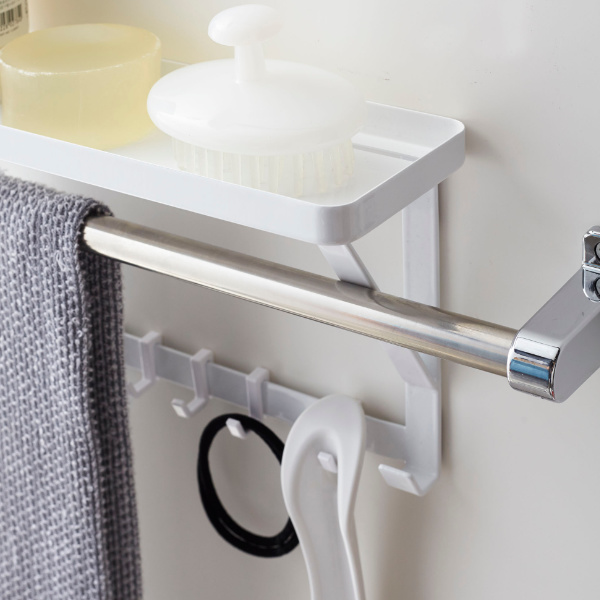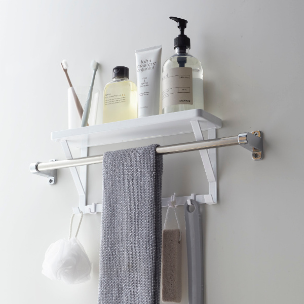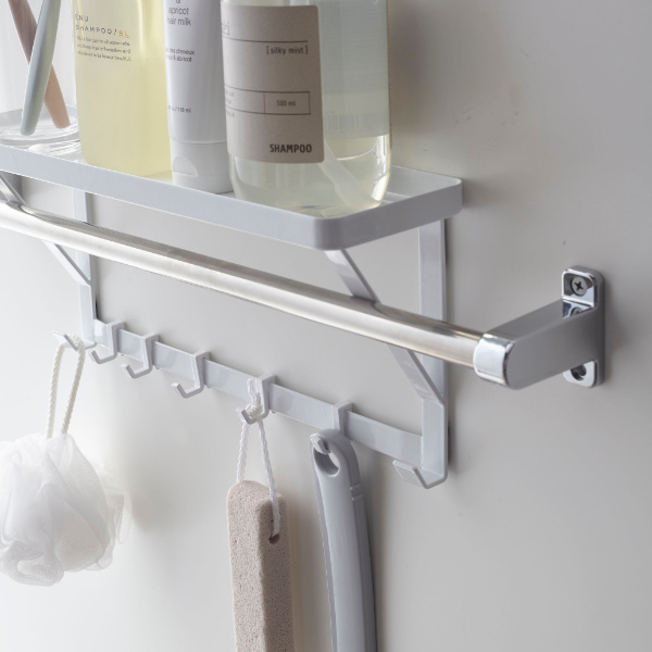タオルバーに差し込むだけで簡単に設置できる、タオルバー上ラックです。付属のフックが5個ついているので、ラックに置いて収納するだけではなく、フックに掛けて小物もまとめて収納できます。