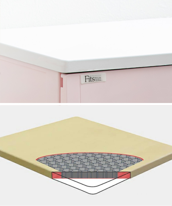 木製天板は、高級感のある木目柄で角にはやさしく自然な丸みがあります。そして、蜂の巣のような六角形を隙間なく並べた「ハニカム構造」で、軽くて丈夫です。