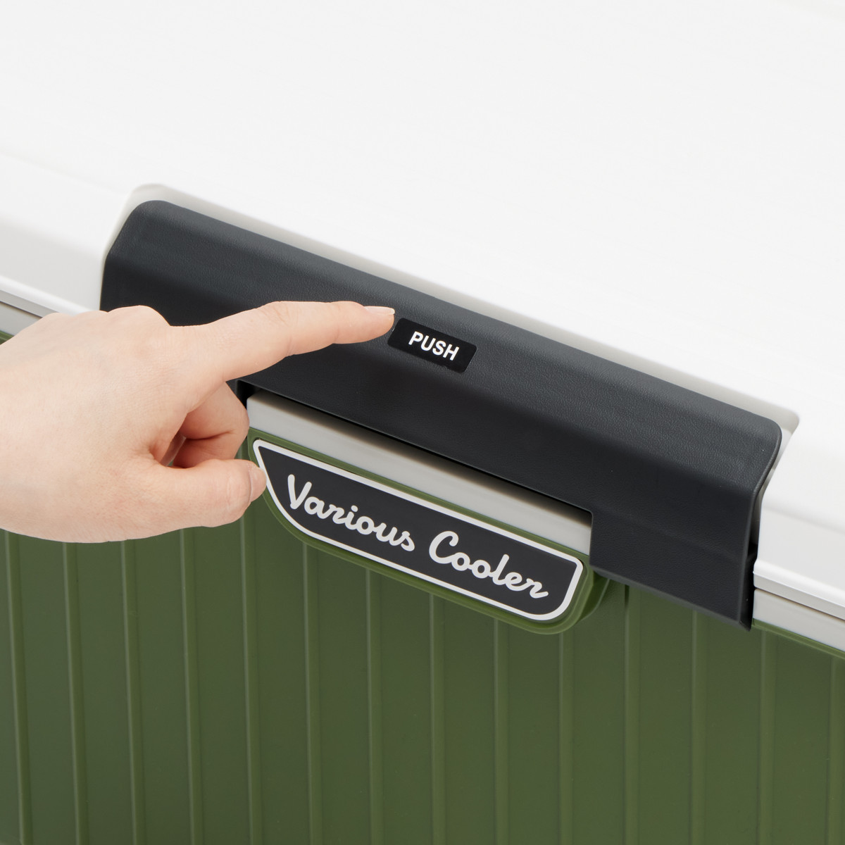 | ワンプッシュ開閉 手が汚れていても、片手でも開けやすい、便利なワンプッシュ開閉です。 | 大型キャリングハンドル付き 大型キャリングハンドルが付いているので、持ち運びやすい仕様です。 |