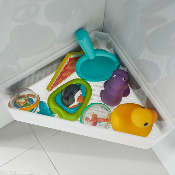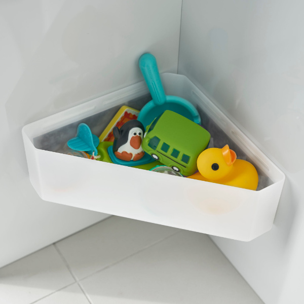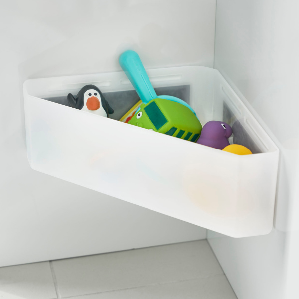 バスルームのコーナーを有効活用できるおもちゃコーナーラックです。雑然としがちなバスグッズやおもちゃをすっきり収納できます。強力なマグネットで壁面にピタッとくっつきます。