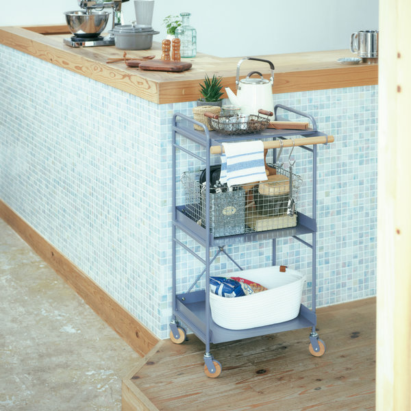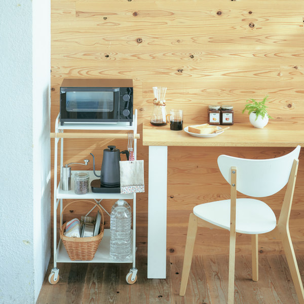 スチール×天然木で、お部屋に馴染みやすいおしゃれなワゴン。天然木の取手には、ミトンや布巾などの小物が掛けられます。