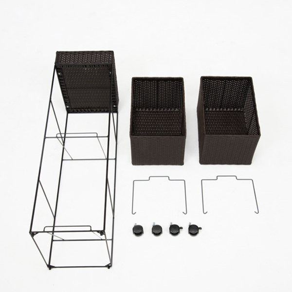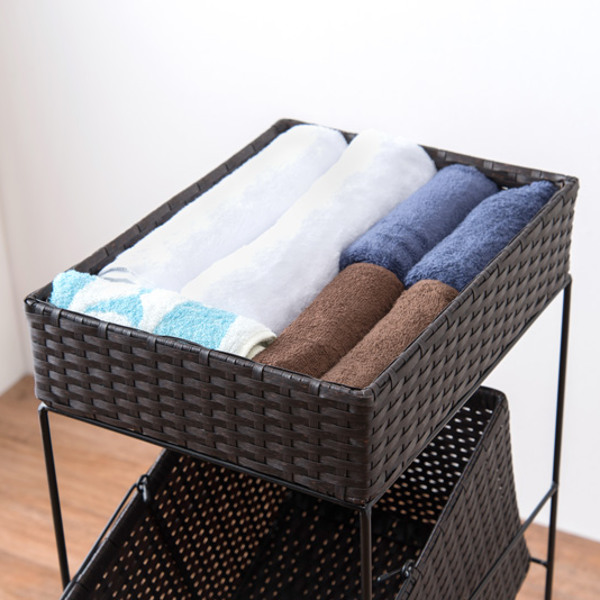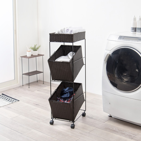 ランドリーラック 3段 ランドリーワゴン ランドリーバスケット バスケット付 縦型 ラタン調 ( ラタン スリム キャスター キャスター付 洗濯 バスケット 脱衣かご ラック 洗濯物入れ 大容量 洗濯かご 四角 収納 防水 分別 ) 【ダークブラウン】