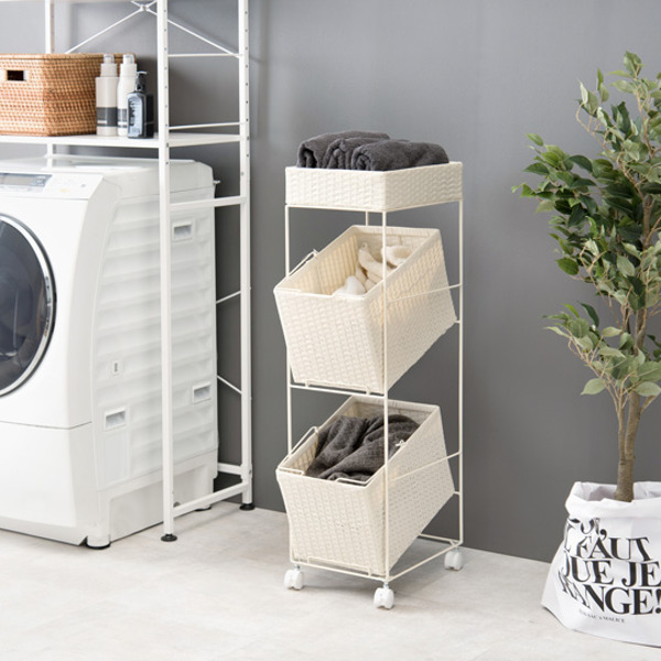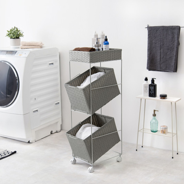 傾斜がついているので衣類が取り出しやすく、楽に出し入れができます。バスケットのみを持ち運びたいときも簡単に取り出せ、洗濯機から出した洗濯物を入れてベランダへ、という使い方ができ用途が広がります。