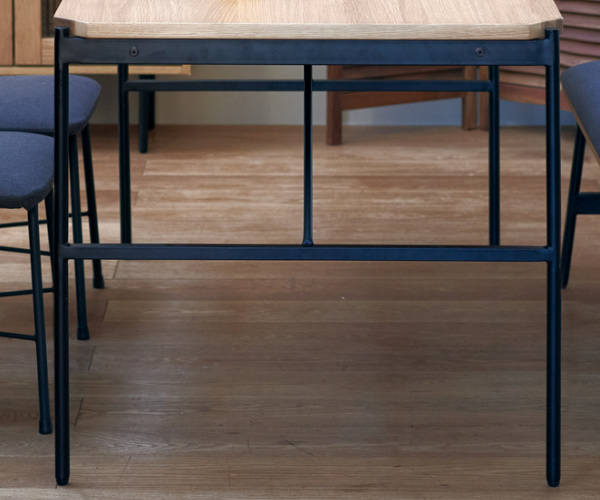 切り落とした4つの角がアイコンのダイニングテーブルです。クリア塗装で仕上げた天板と細めのスチールでシンプルに構成されており、凛とした佇まいでありながら主張せずお部屋に馴染むデザインです。