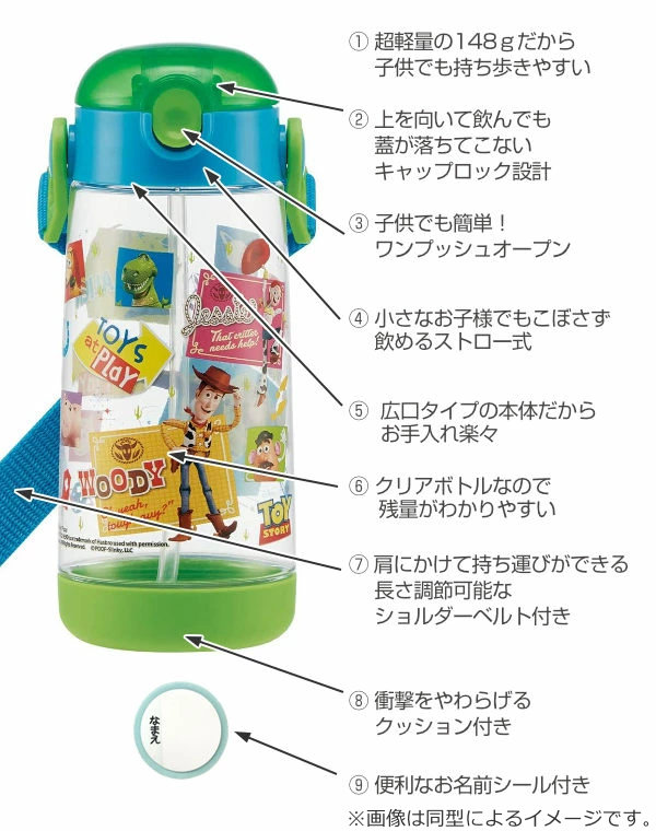 軽くて扱いやすいプラスチック製のストロータイプの水筒です。ストローなのでボトルを傾けずに飲め、倒しても中身がこぼれる心配がなく、小さなお子様や入園前のお子様におすすめです。