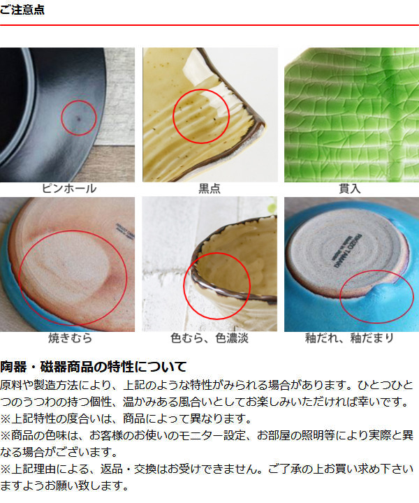 原料や製造方法により、上記のような特性がみられる場合があります。ひとつひとつのうつわの持つ個性、温かみある風合いとしてお楽しみいただければ幸いです。