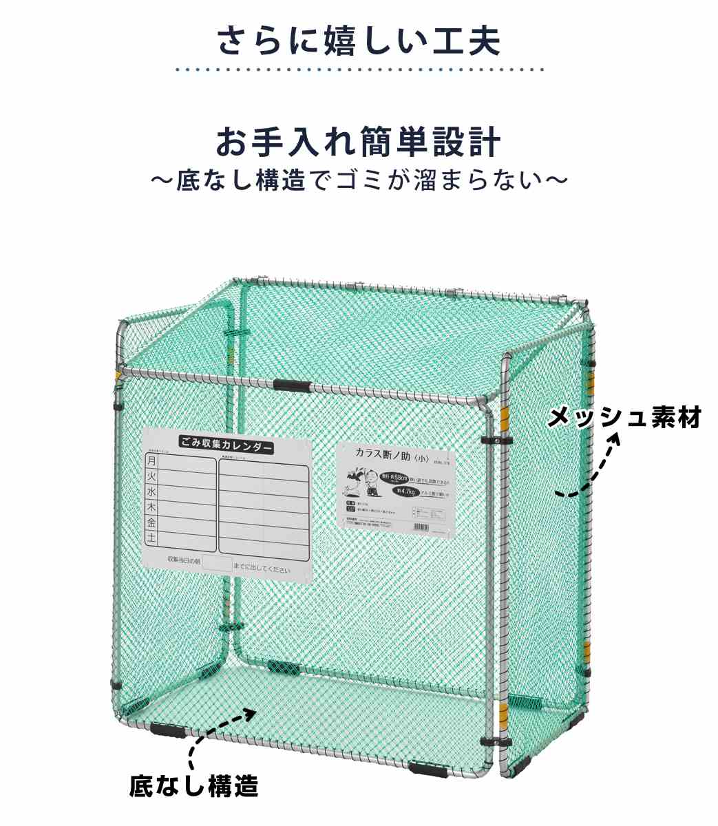 ゴミが詰まらず、サッと掃除ができる「底なし構造」を採用。底板がないことで、たまったゴミや汚れが自然と地面に落ち、掃除の手間を大幅に軽減します。さらに、全体が通気性に優れたメッシュ素材で作られているため、湿気がこもらず、イヤなニオイも発生しにくいのが特徴。いつでも清潔で快適なゴミステーション環境を保てます。