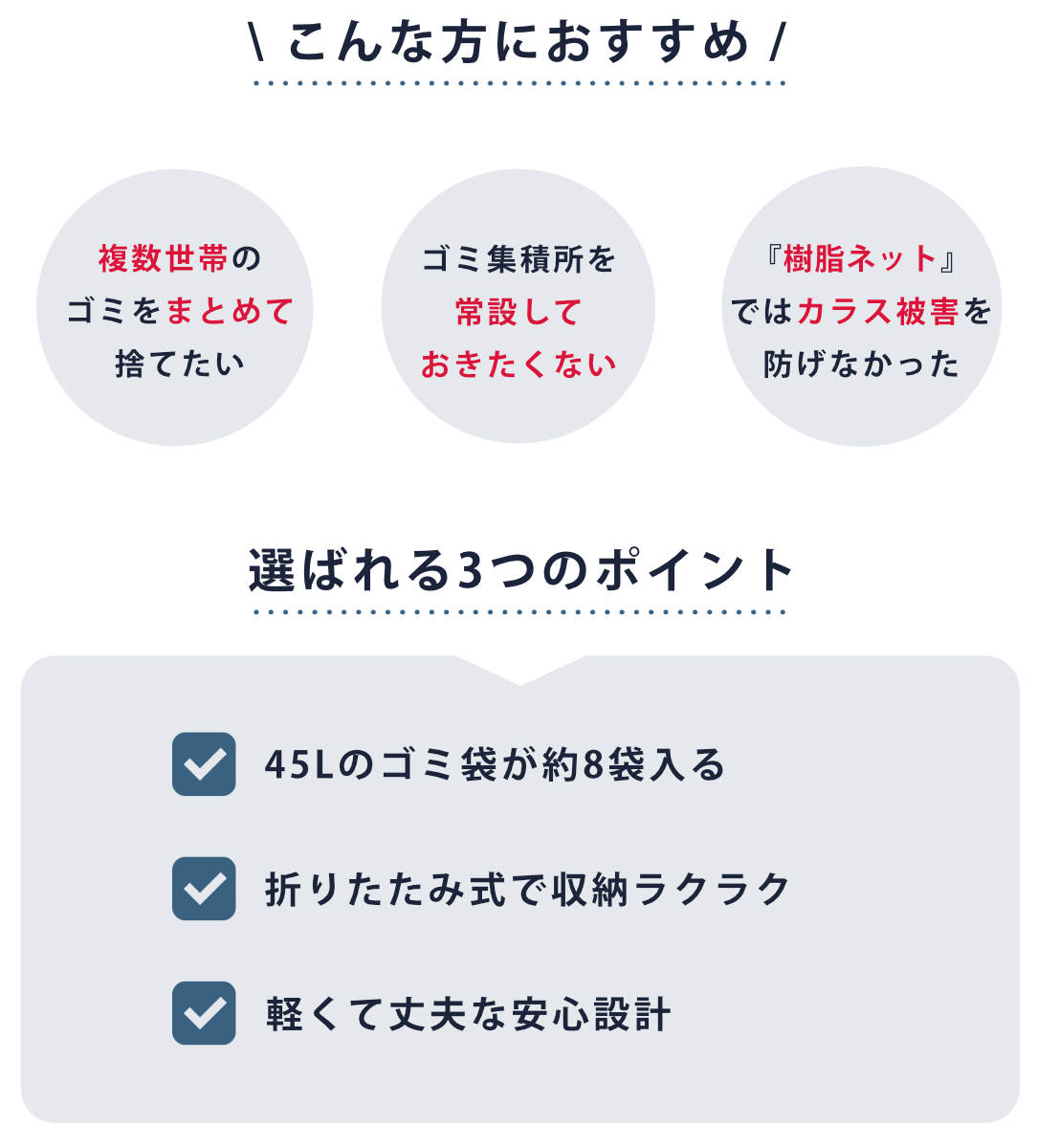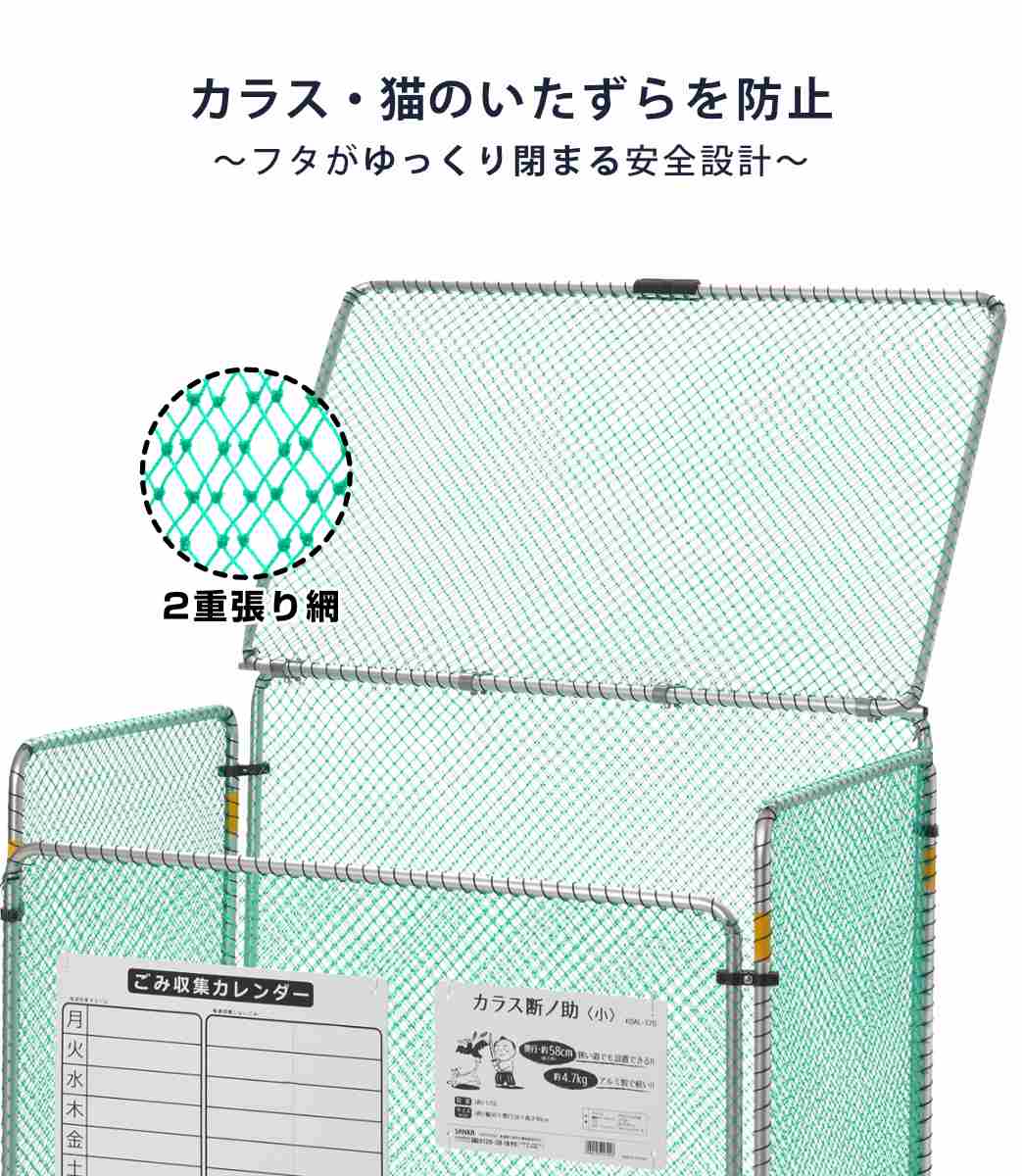 フタ付き設計でカラスや猫による被害を防ぎ、ゴミの飛び散りをガード。便利な取っ手で開閉もラクラク。さらに破れにくい2重張り網がゴミをしっかり守ります。フタはゆっくり閉まる安全設計で、小さなお子さまやご年配の方も安心です。