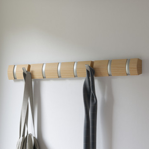 ウッドをベースとした温かくシンプルなデザインで、玄関やリビング、寝室など設置場所を選ばずスッキリ馴染みます。使用しないときはフックを閉じて、すっきりとした印象に。インテリアの一部としても楽しめます。