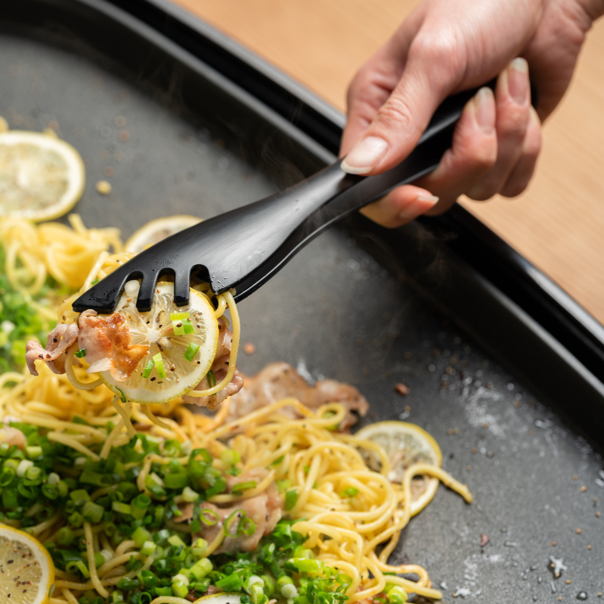 卓上調理などに便利な小ぶりのナイロントングです。ホットプレートでの調理などに使いやすいサイズ感になっています。耐熱温度180度なので焼きそばやお肉料理など、幅広い料理にお使いいただけます。