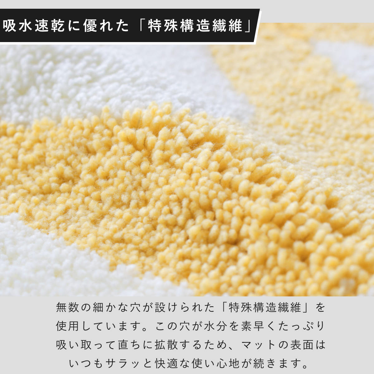 無数の細かな穴が設けられた「特殊構造繊維」を使用しています。この穴が水分を素早くたっぷり吸い取って直ちに拡散するため、マットの表面はいつもサラッと快適な使い心地が続きます。