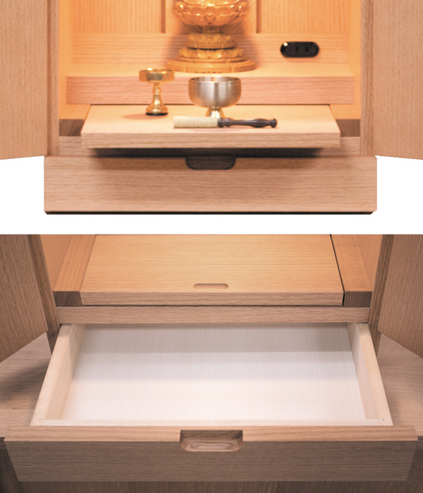 引出しが1杯あるので、ろうそくや線香といった小物をしまうのに便利です。また、膳引きが付いており、仏具をのせたまま収納できます。