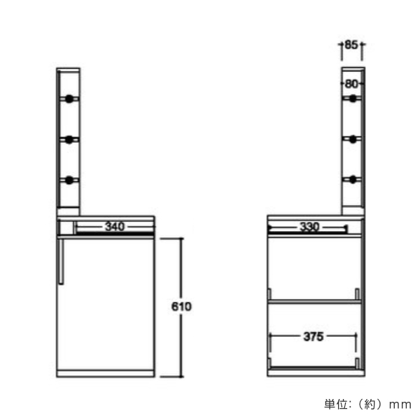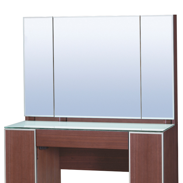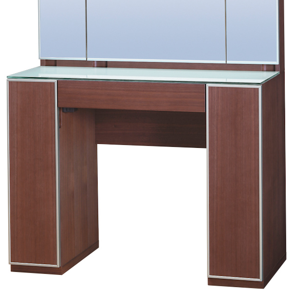 | 材質 | 天板:ガラス(飛散防止ホワイトフィルム貼りガラス) 扉:アルミフチ材、ミラー 本体・扉:突板(タモ天然木化粧繊維板、ウォールナット天然木化粧繊維板・ウレタン樹脂塗装)、ホワイト(MDF・ウレタン樹脂塗装) 引出し:キリ材、プリント化粧繊維板 |