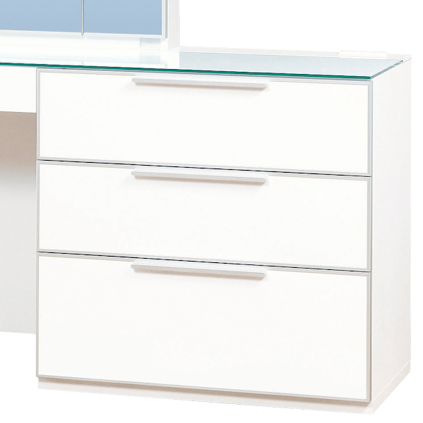 | 材質 | 天板:ガラス(飛散防止ホワイトフィルム貼りガラス) 扉:アルミフチ材、ミラー 本体・扉:突板(タモ天然木化粧繊維板、ウォールナット天然木化粧繊維板・ウレタン樹脂塗装)、ホワイト(MDF・ウレタン樹脂塗装) 引出し:キリ材、プリント化粧繊維板 |