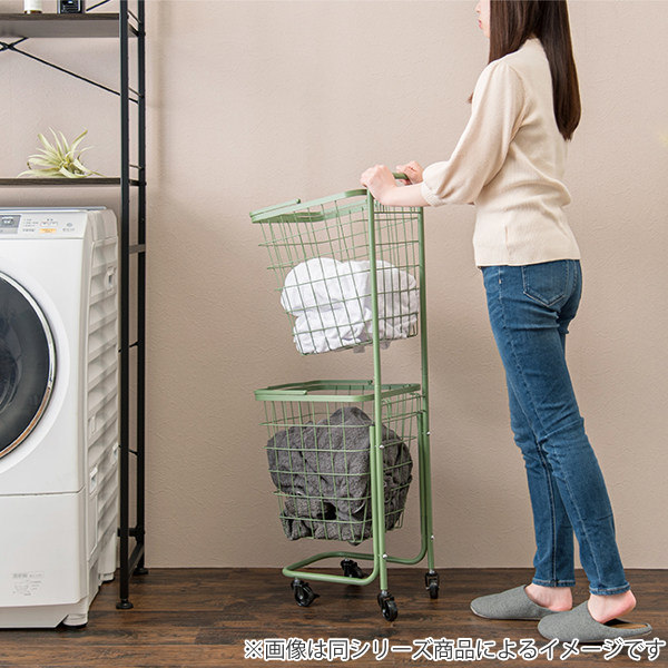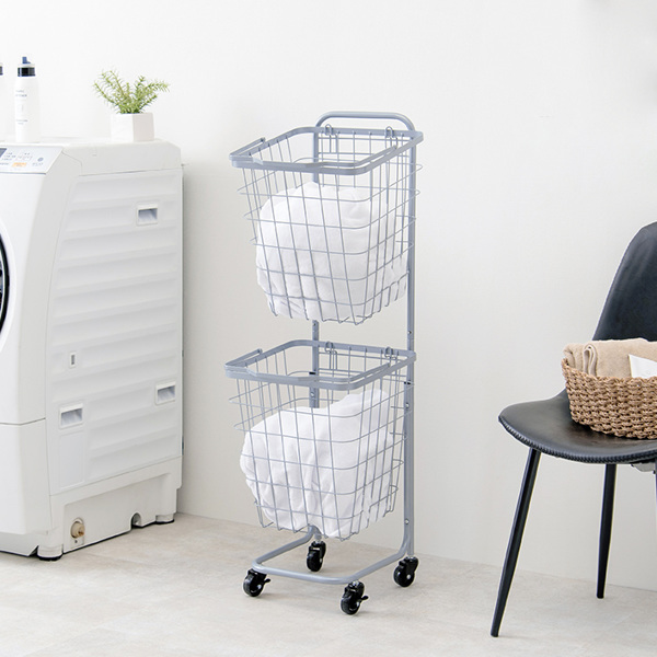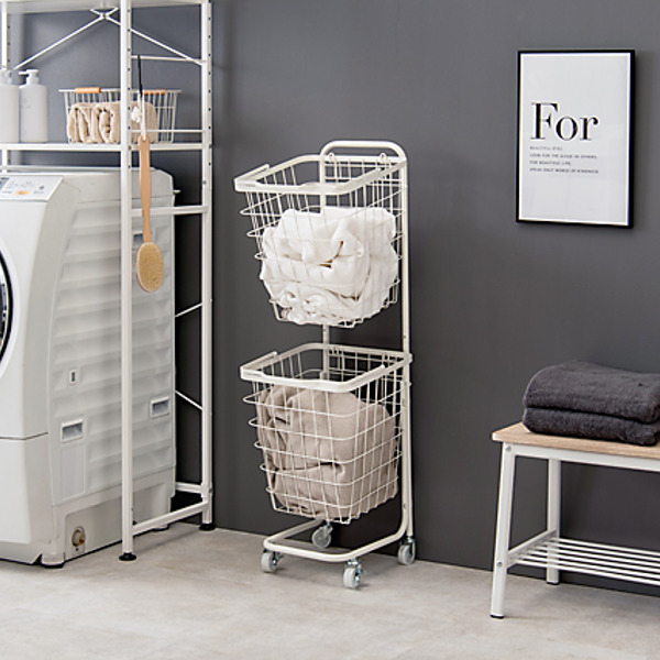 衣類やタオルを分別できるスクエアタイプの2段ランドリーラックです。2つのバスケットに洗濯物を分別することで、洗濯時の手間を省いて時間を節約できます。縦方向に収納できるので狭い場所でも圧迫感を感じず、ランドリー用品のストック入れとしても最適です。