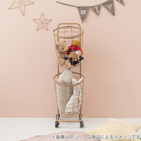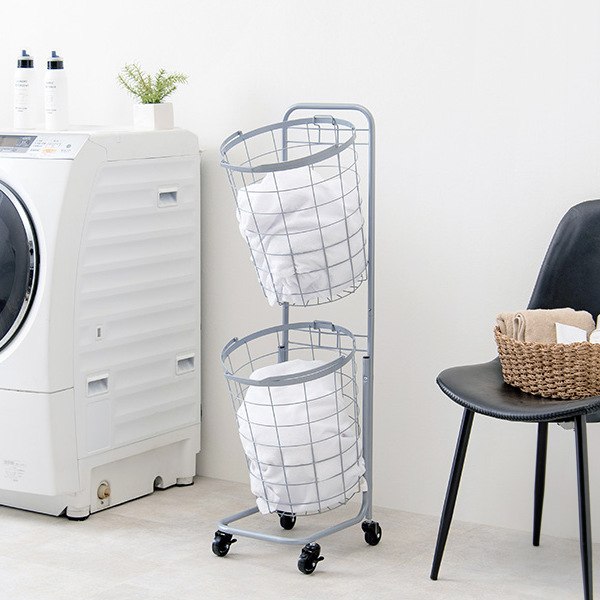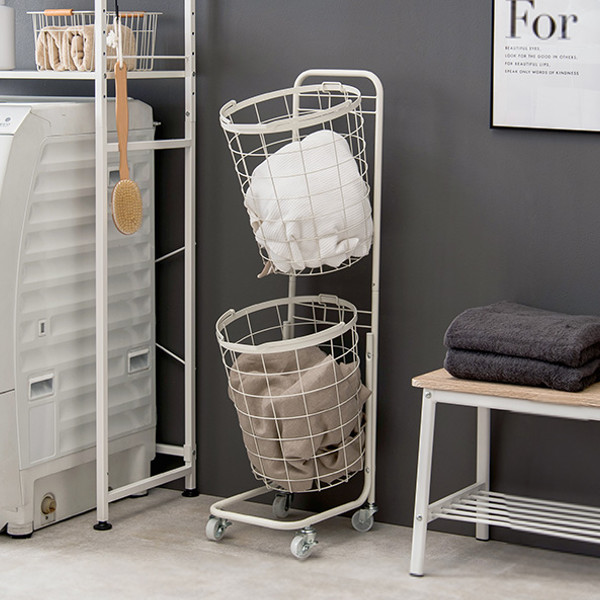 衣類やタオルを分別できるラウンドタイプの2段ランドリーラックです。2つのバスケットに洗濯物を分別することで、洗濯時の手間を省いて時間を節約できます。縦方向に収納できるので狭い場所でも圧迫感を感じず、ランドリー用品のストック入れとしても最適です。
