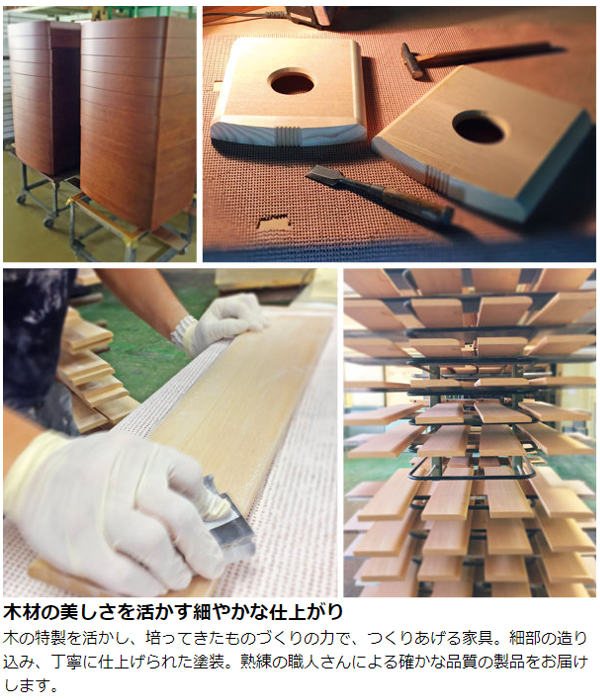 木の特製を活かし、培ってきたものづくりの力で、つくりあげる家具。細部の造り込み、丁寧に仕上げられた塗装。熟練の職人さんによる確かな品質の製品をお届けします。