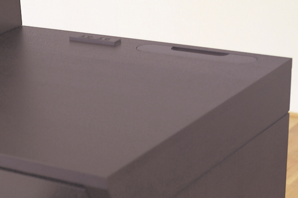 天板奥行には、コンセントが2口付いているのでパソコンの充電やデスクライトを付けることができ便利です。また配線スペースがあるので、デスク周りの配線が綺麗に整い、作業の邪魔になりません。