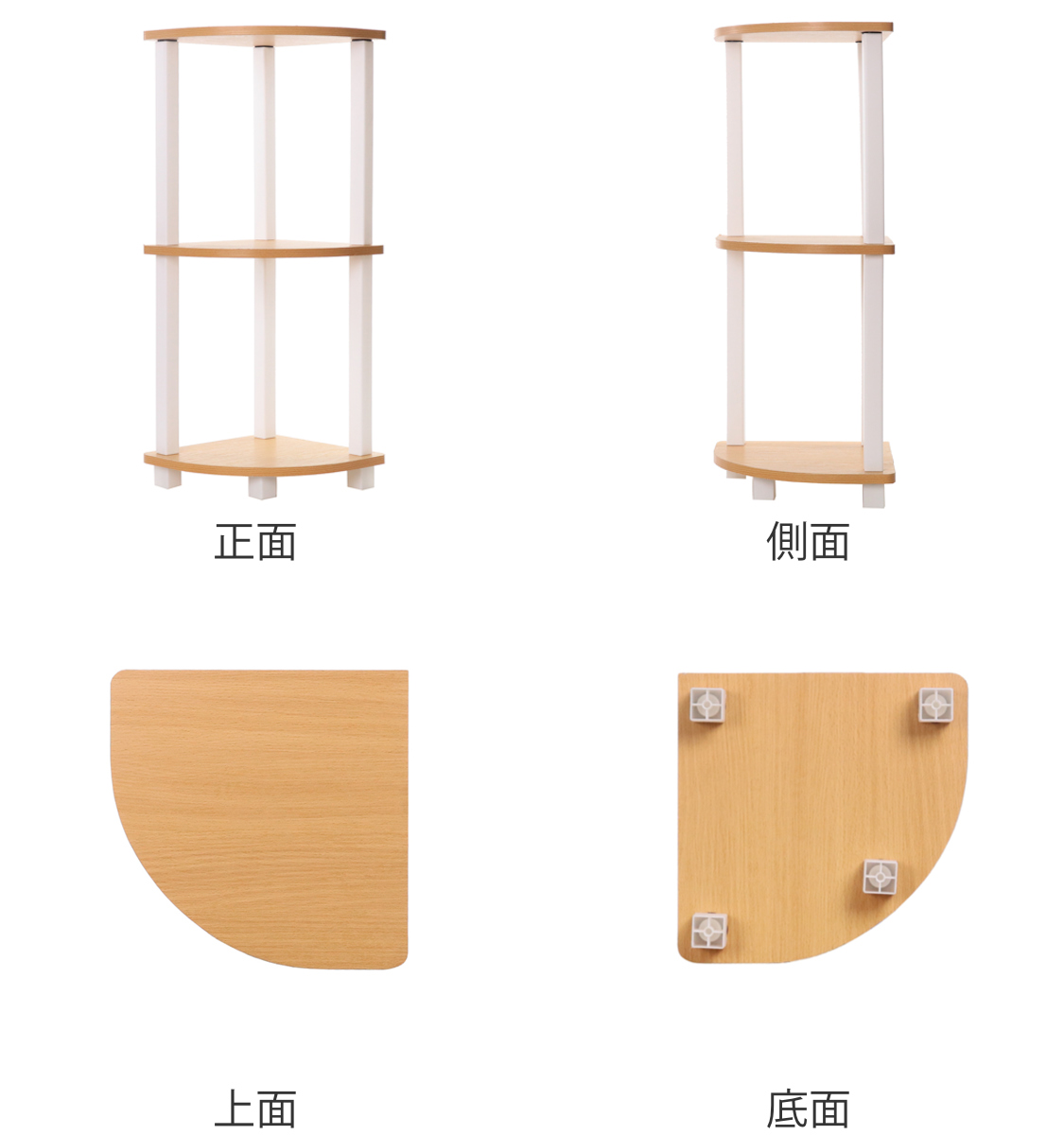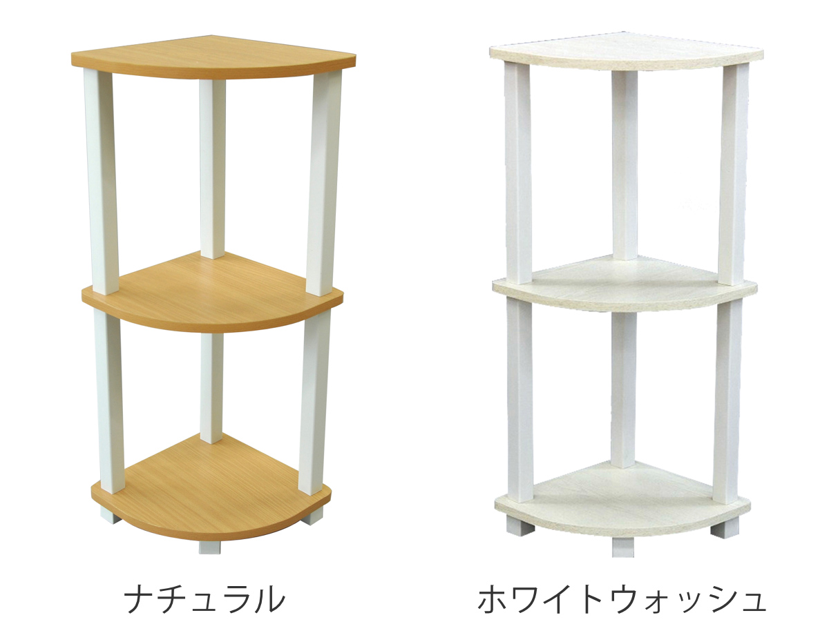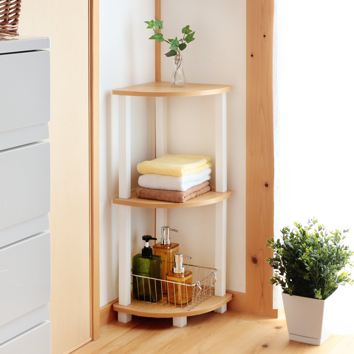 工具不要で簡単に組み立てることができるコーナーラックです。お部屋の隅のちょっとしたスペースを有効活用するのにぴったりです。空間に馴染む明るめのカラーで、インテリアの邪魔をしません。