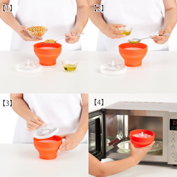 本体にポップコーンの原料豆と、オリーブオイルを入れて、蓋をして電子レンジでチンするだけです。塩やバターなど、お好みのトッピングでお楽しみ頂けます。
