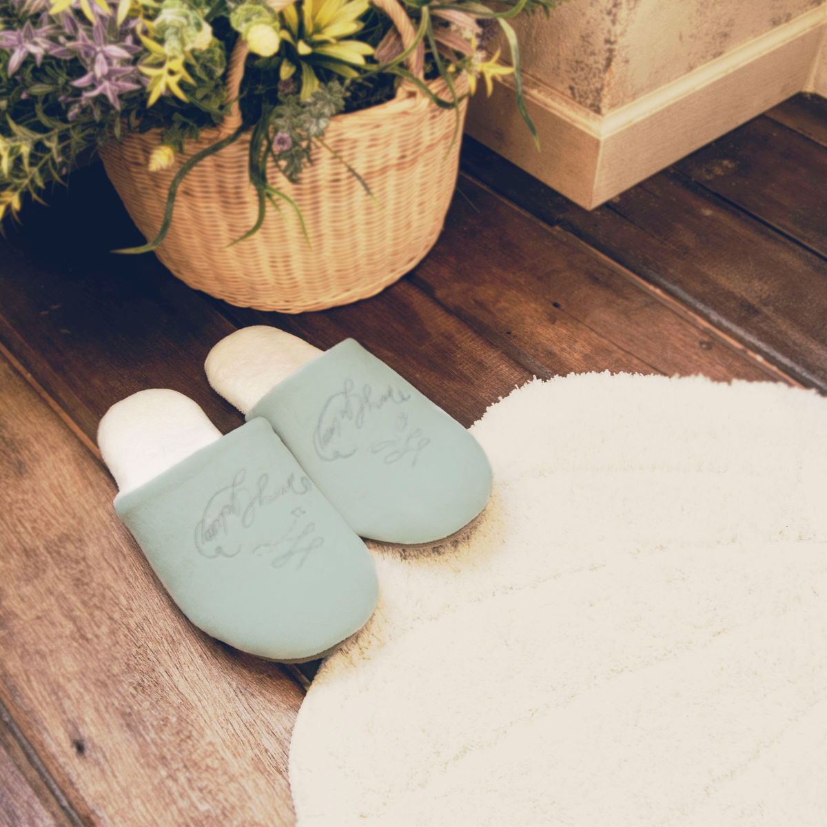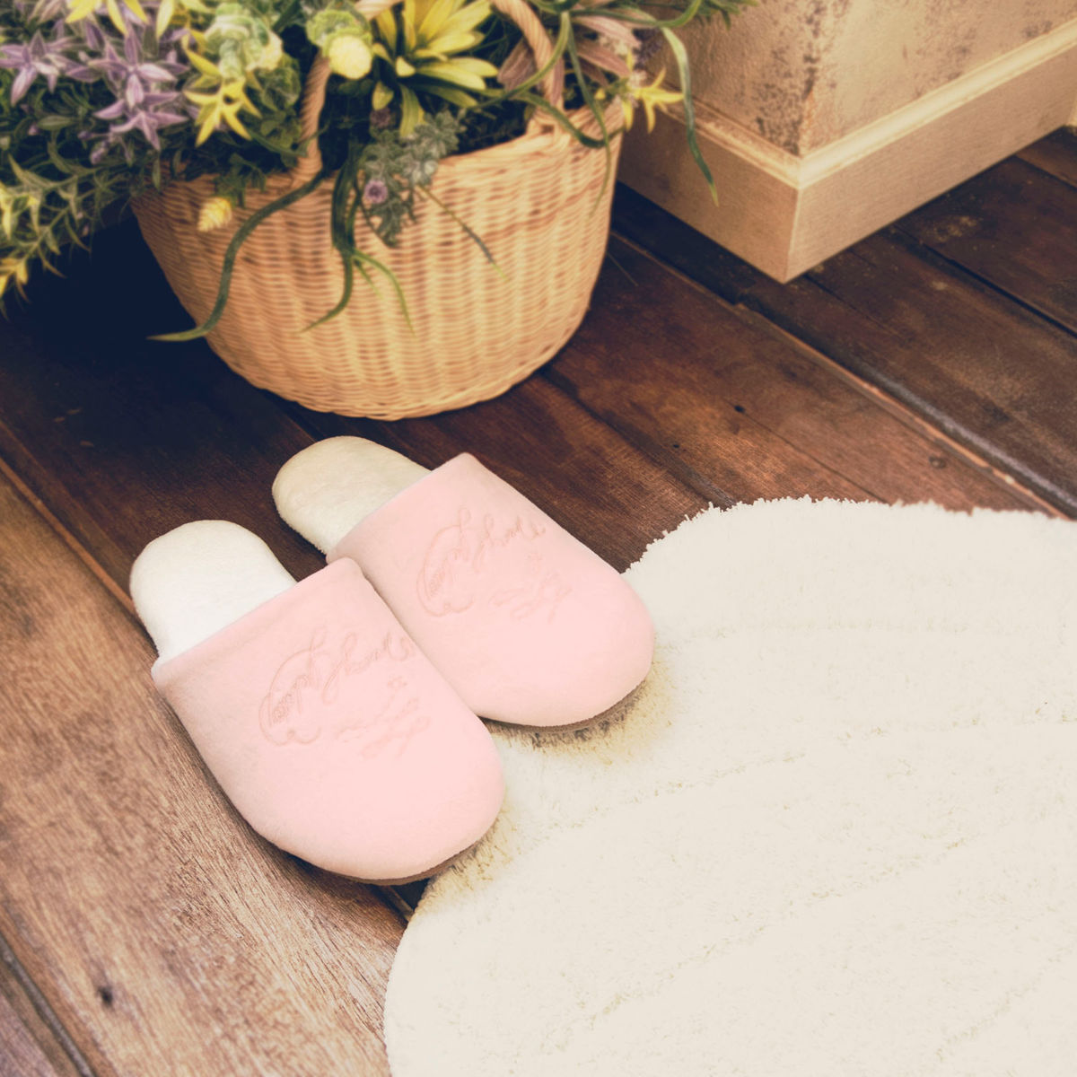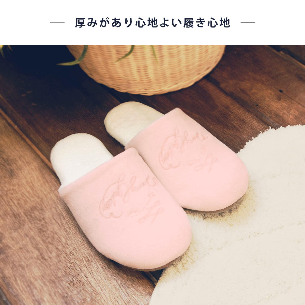 スリッパの適応サイズは24cmです。しっとりとした、手触りの良い生地を使用しており、ソール部には厚みがあり、心地よい履き心地です。おとな可愛いパステルカラーが甘くて、やさしい上品な風合いです。