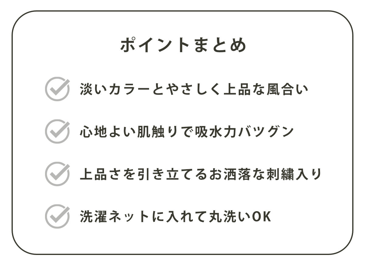 さらっとした肌触り、程よいふわっと感が心地よく、さらに水分をスッと素早く吸水します。細めの繊維で密度があるため、足を乗せた際にしっかりとした感触を伝えてくれます。