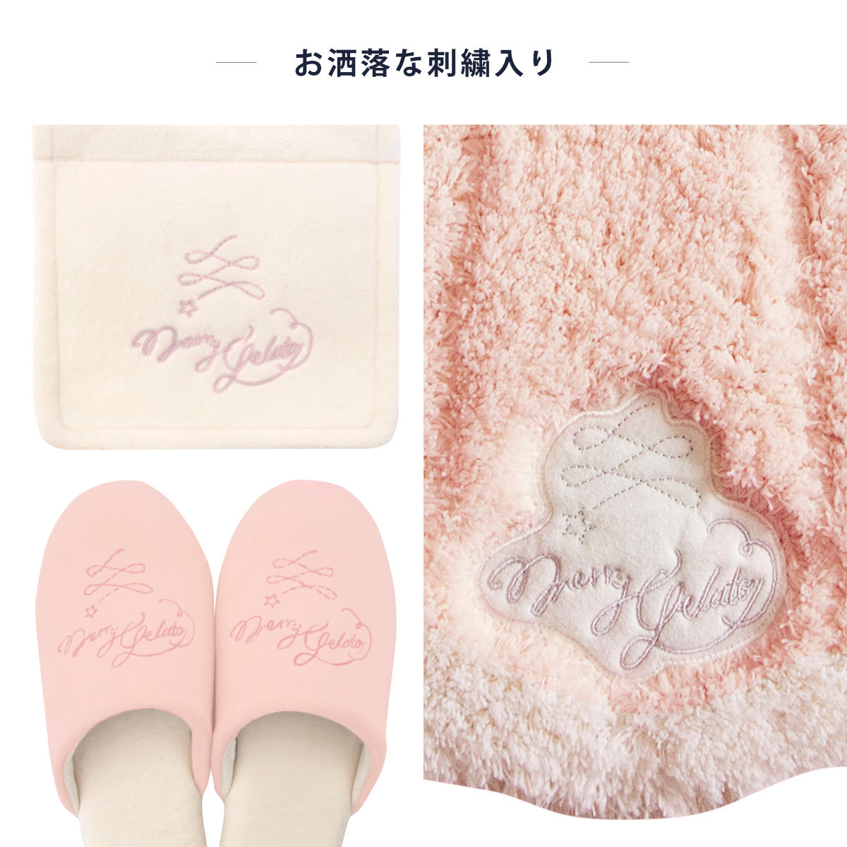 「メリージェラート」シリーズは、淡いカラーと女性らしいデザインが特長のファブリックシリーズです。「merry」=楽しいという意味の通り、楽しく柔らかな空間を演出します。蓋カバー、トイレマット、ペーパーホルダーカバー、スリッパで揃えられ、統一感のある、楽しく柔らかな空間を演出できます。