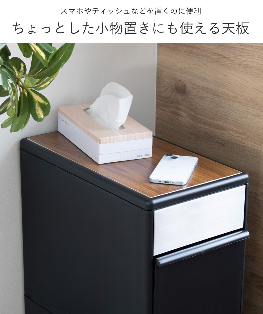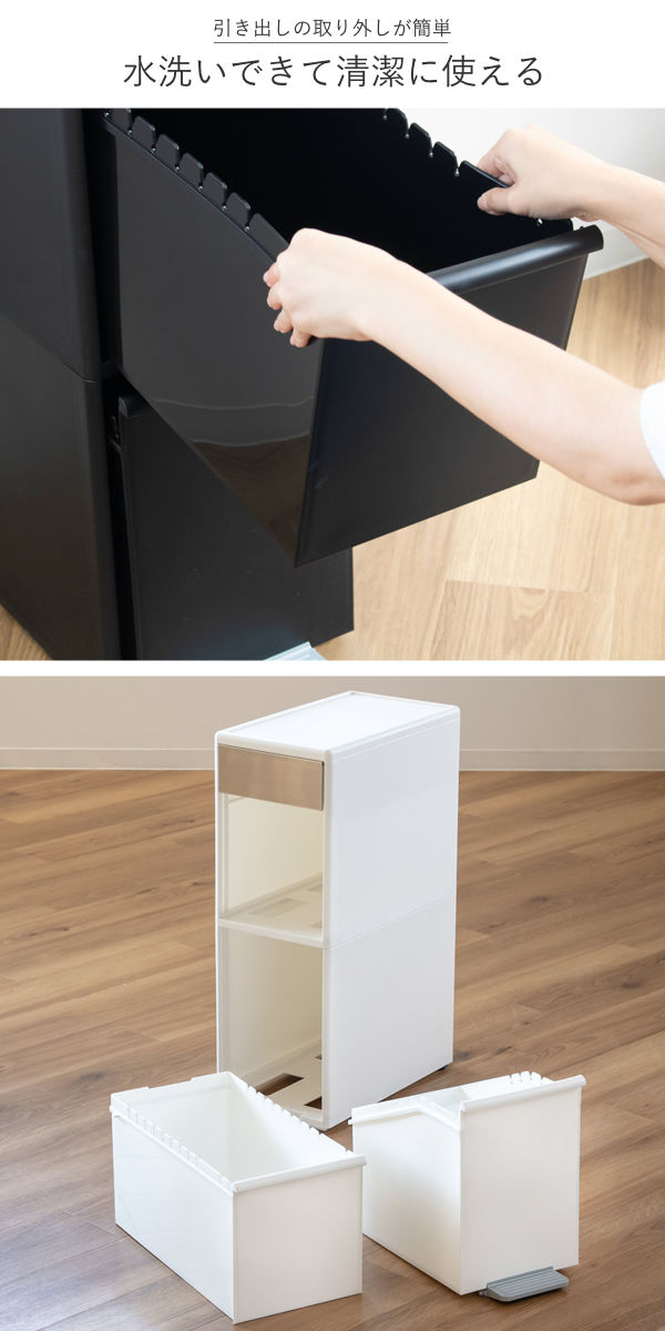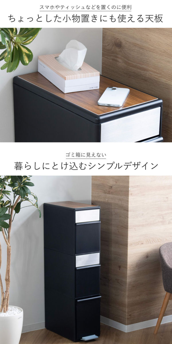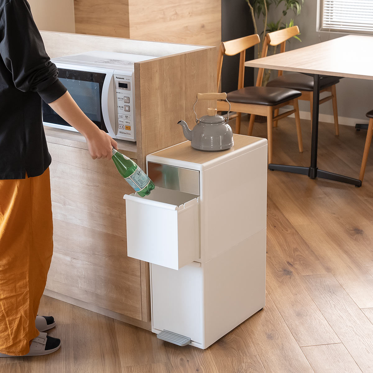 キッチンの空間を有効に使える、幅約25.5cmのスリムなゴミ箱です。冷蔵庫・シンク・食器棚横などのキッチンのデッドスペースに設置できて、ペットボトル・缶などのかさばる資源ゴミもひとまとめにできます。