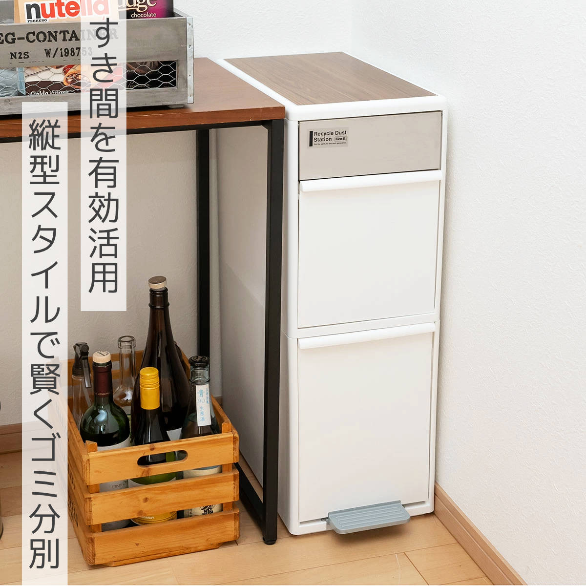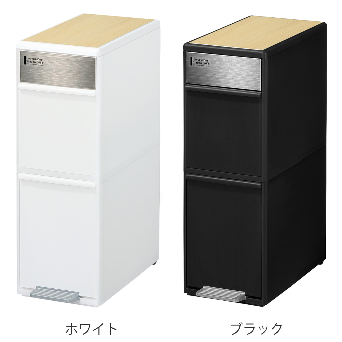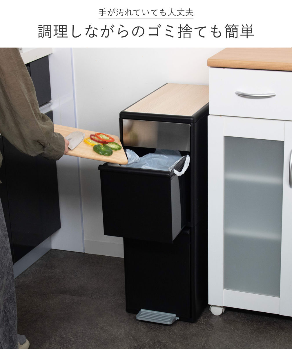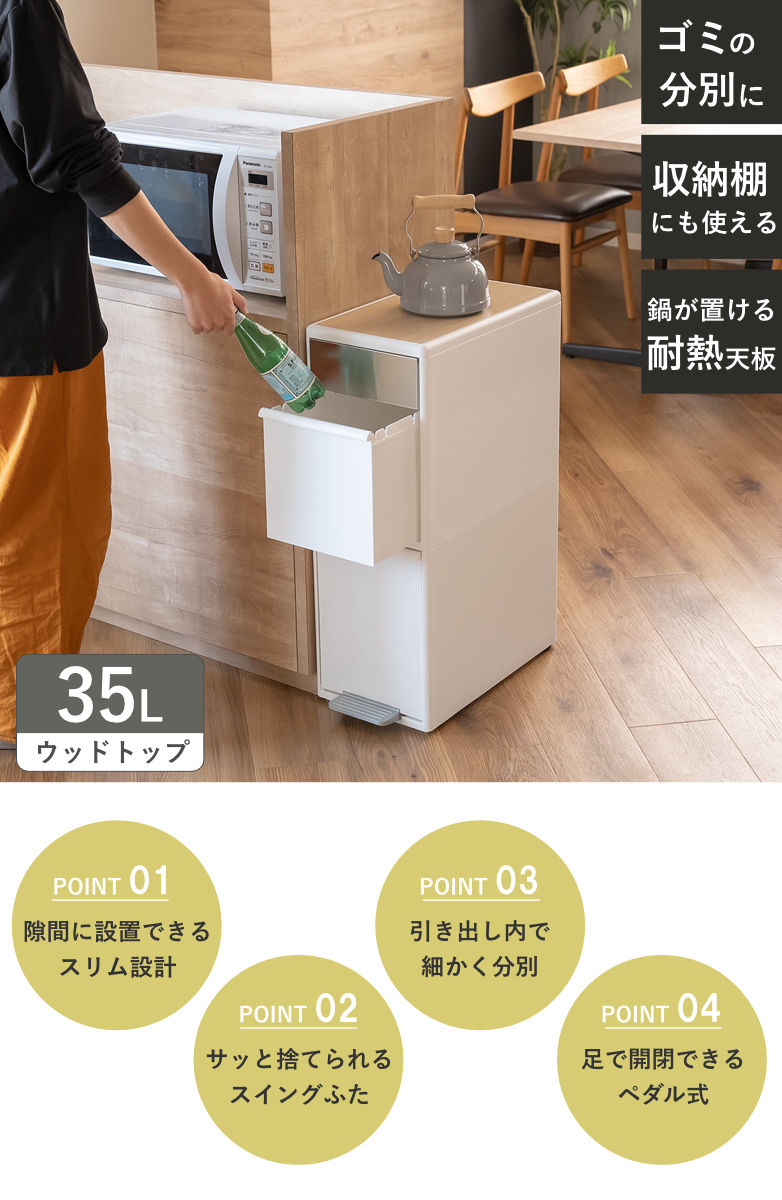ゴミ箱 35L 幅25.5cm 2段 分別 スイングステーション ワイド ウッドトップ ( 35リットル 縦型 ダストボックス ごみ箱 キッチン 分別ゴミ箱 スリム ペダル式 耐熱性 鍋置き ふた付き 引き出し スイングふた ペダル 隙間 収納 ) 【ホワイト】