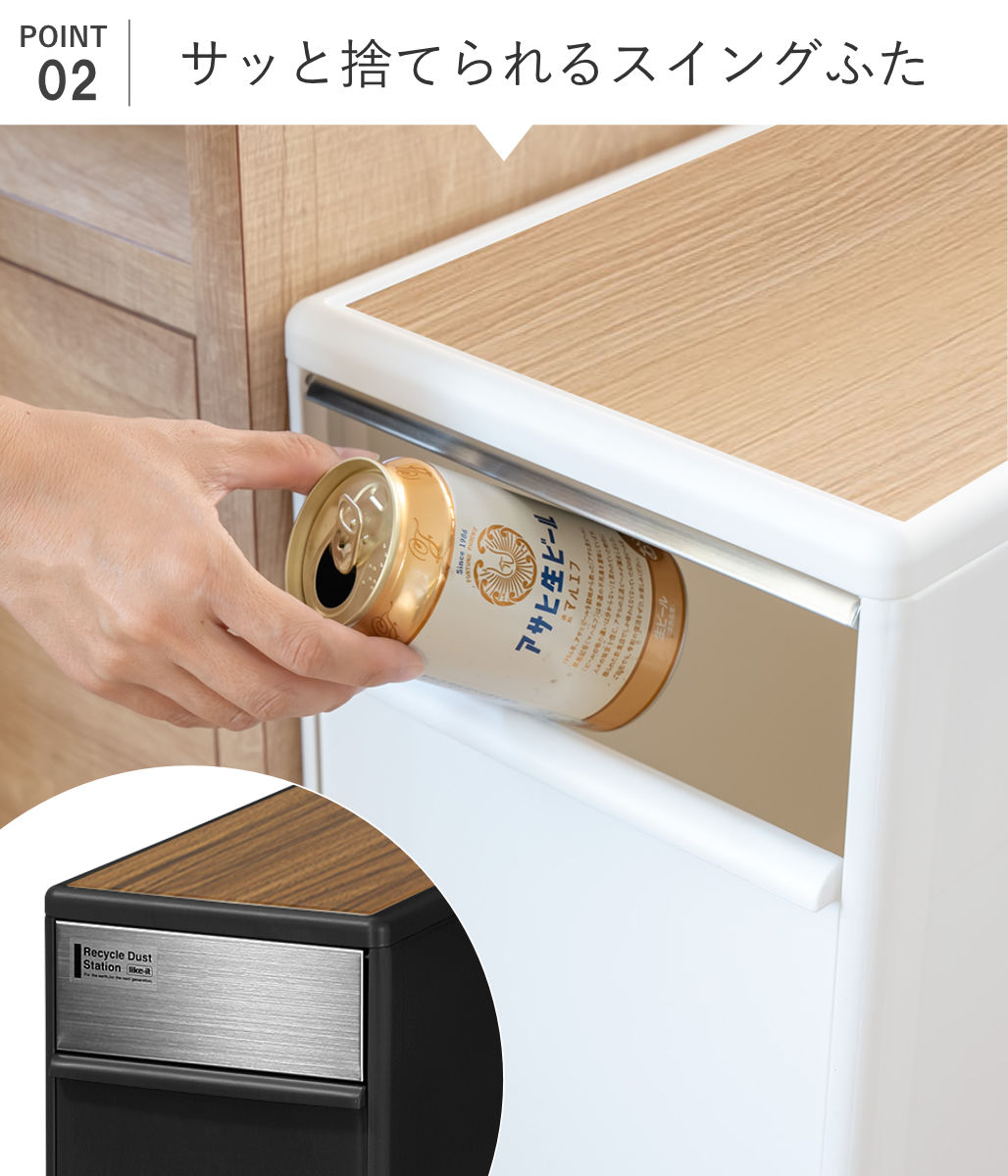 上段にはプッシュすれば、片手でサッとゴミを捨てられるスイング式のふたがついています。汚れの落ちやすいステンレス素材を使用しており、お手入れしやすく美しい外観を保てます。